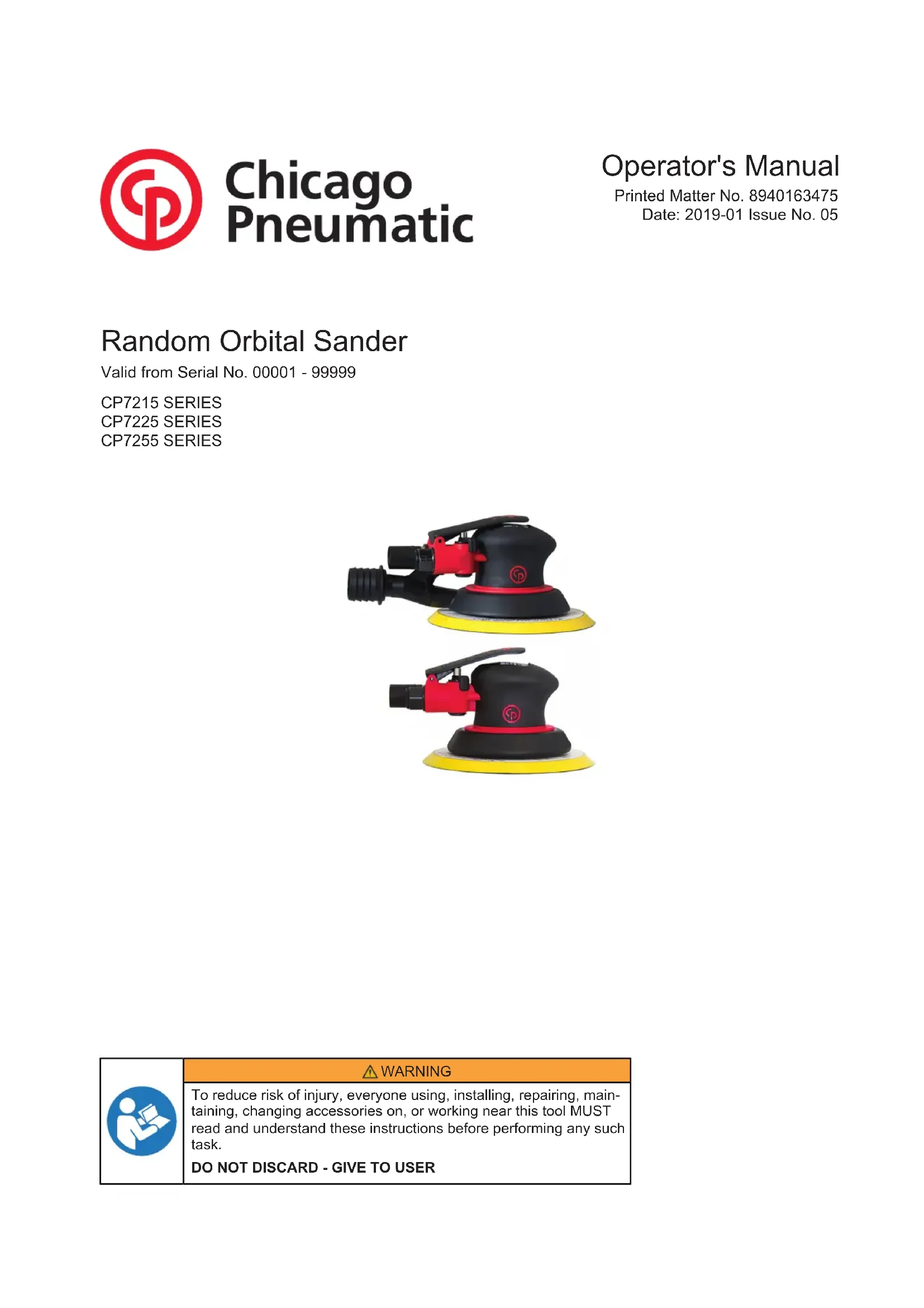 Les autorités peuvent obtenir les informations techniques pertinentes en s’adressant à : Pascal Roussy, R&D Manager, Ets Georges Renault, 38 rue Bobby Sands, BP10273 44818 Saint Herblain, France Saint-Herblain, Pascal ROUSSY Signature du déclarant Utilisation prévue Ce produit est conçu pour l'enlèvement de matière et le polis- sage à l'aide d'abrasifs appliqués ou d'accessoires de polis- sage. Aucune autre utilisation n'est autorisée. Pour utilisation professionnelle uniquement.Random orbital Sanders © Chicago Pneumatic - 8940163475