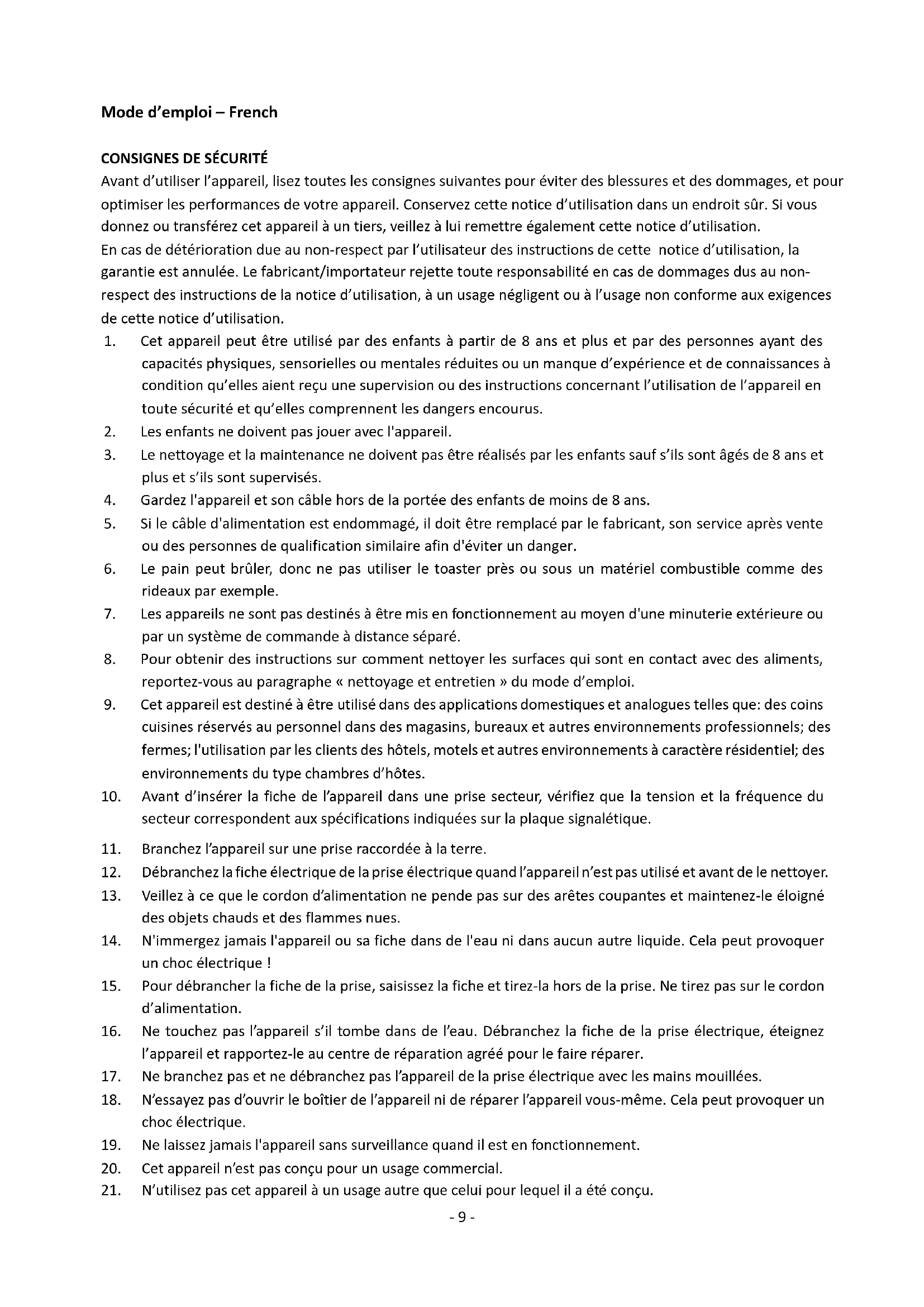 Avant d’utiliser l’appareil, lisez toutes les consignes suivantes pour éviter des blessures et des dommages, et pour optimiser les performances de votre appareil. Conservez cette notice d’utilisation dans un endroit sûr. Si vous donnez ou transférez cet appareil à un tiers, veillez à lui remettre également cette notice d’utilisation. En cas de détérioration due au non-respect par l’utilisateur des instructions de cette notice d’utilisation, la garantie est annulée. Le fabricant/importateur rejette toute responsabilité en cas de dommages dus au non- respect des instructions de la notice d’utilisation, à un usage négligent ou à l’usage non conforme aux exigences de cette notice d’utilisation.
