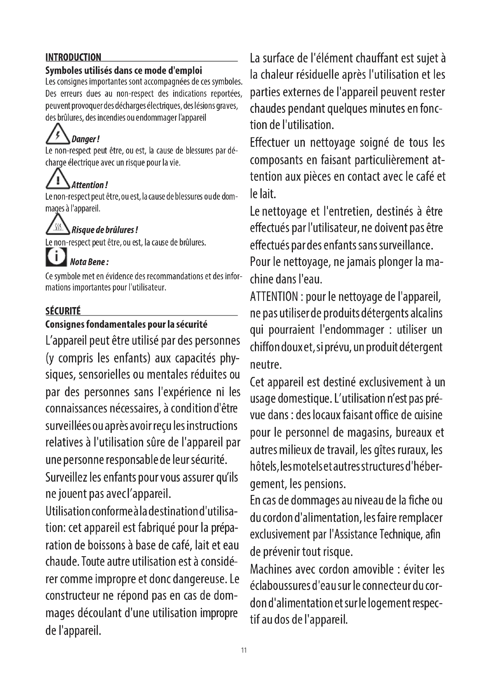 ration and recycling centre. EN11 INTRODUCTION Symboles utilisés dans ce mode d'emploi Les consignes importantes sont accompagnées de ces symboles. Des erreurs dues au non-respect des indications reportées, peuvent provoquer des décharges électriques, des lésions graves, des brûlures, des incendies ou endommager l'appareil Danger ! Le non-respect peut être, ou est, la cause de blessures par dé- charge électrique avec un risque pour la vie. Attention ! Le non-respect peut être, ou est, la cause de blessures ou de dom- mages à l'appareil. Risque de brûlures ! Le non-respect peut être, ou est, la cause de brûlures. Nota Bene : Ce symbole met en évidence des recommandations et des infor- mations importantes pour l'utilisateur. SÉCURITÉ Consignes fondamentales pour la sécurité L’appareil peut être utilisé par des personnes (y compris les enfants) aux capacités phy- siques, sensorielles ou mentales réduites ou par des personnes sans l'expérience ni les connaissances nécessaires, à condition d'être surveillées ou après avoir reçu les instructions relatives à l'utilisation sûre de l'appareil par une personne responsable de leur sécurité. Surveillez les enfants pour vous assurer qu’ils ne jouent pas avec l’appareil. Utilisation conforme à la destination d'utilisa- tion: cet appareil est fabriqué pour la prépa- ration de boissons à base de café, lait et eau chaude. Toute autre utilisation est à considé- rer comme impropre et donc dangereuse. Le constructeur ne répond pas en cas de dom- mages découlant d'une utilisation impropre de l'appareil. La surface de l'élément chauffant est sujet à la chaleur résiduelle après l'utilisation et les parties externes de l'appareil peuvent rester chaudes pendant quelques minutes en fonc- tion de l'utilisation. Effectuer un nettoyage soigné de tous les composants en faisant particulièrement at- tention aux pièces en contact avec le café et le lait. Le nettoyage et l'entretien, destinés à être effectués par l'utilisateur, ne doivent pas être effectués par des enfants sans surveillance. Pour le nettoyage, ne jamais plonger la ma- chine dans l'eau. ATTENTION : pour le nettoyage de l'appareil, ne pas utiliser de produits détergents alcalins qui pourraient l'endommager : utiliser un chiffon doux et, si prévu, un produit détergent neutre. Cet appareil est destiné exclusivement à un usage domestique. L’utilisation n’est pas pré- vue dans : des locaux faisant office de cuisine pour le personnel de magasins, bureaux et autres milieux de travail, les gîtes ruraux, les hôtels, les motels et autres structures d'héber- gement, les pensions. En cas de dommages au niveau de la fiche ou du cordon d'alimentation, les faire remplacer exclusivement par l'Assistance Technique, afin de prévenir tout risque. Machines avec cordon amovible : éviter les éclaboussures d'eau sur le connecteur du cor- don d'alimentation et sur le logement respec- tif au dos de l'appareil.12 ATTENTION : Modèles avec surfaces en verre: Ne pas utiliser l'appareil si la surface est fêlée. UNIQUEMENT POUR LES MARCHÉS EUROPÉENS: L'appareil peut être utilisé par les enfants de plus de 8 ans à condition d'être surveillés ou après avoir reçu les instructions relatives à l'uti- lisation sûre de l'appareil et avoir compris les risques inhérents. Le nettoyage et l'entretien à la charge de l'utilisateur ne peuvent pas être effectués par les enfants de moins de 8 ans et sans surveillance. Tenir l'appareil et son câble hors de la portée des enfants âgés de moins de 8 ans. L'appareil peut être utilisé par des personnes aux capacités physiques, sensorielles ou men- tales réduites ou par des personnes sans l'ex- périence ni les connaissances nécessaires, à condition d'être surveillées ou après avoir reçu les instructions relatives à l'utilisation sûre de l'appareil et compris les risques inhérents. Les enfants ne doivent pas jouer avec l'appa- reil. Toujours débrancher l'appareil du secteur s'il est laissé sans surveillance et avant de le mon- ter, de le démonter ou de le nettoyer. Les surfaces présentant ce symbole deviennent chaudes durant l’utilisation (le symbole est présent seulement sur certains modèles). Danger ! L'appareil fonctionnant au courant électrique, respecter les consignes de sécurité suivantes :