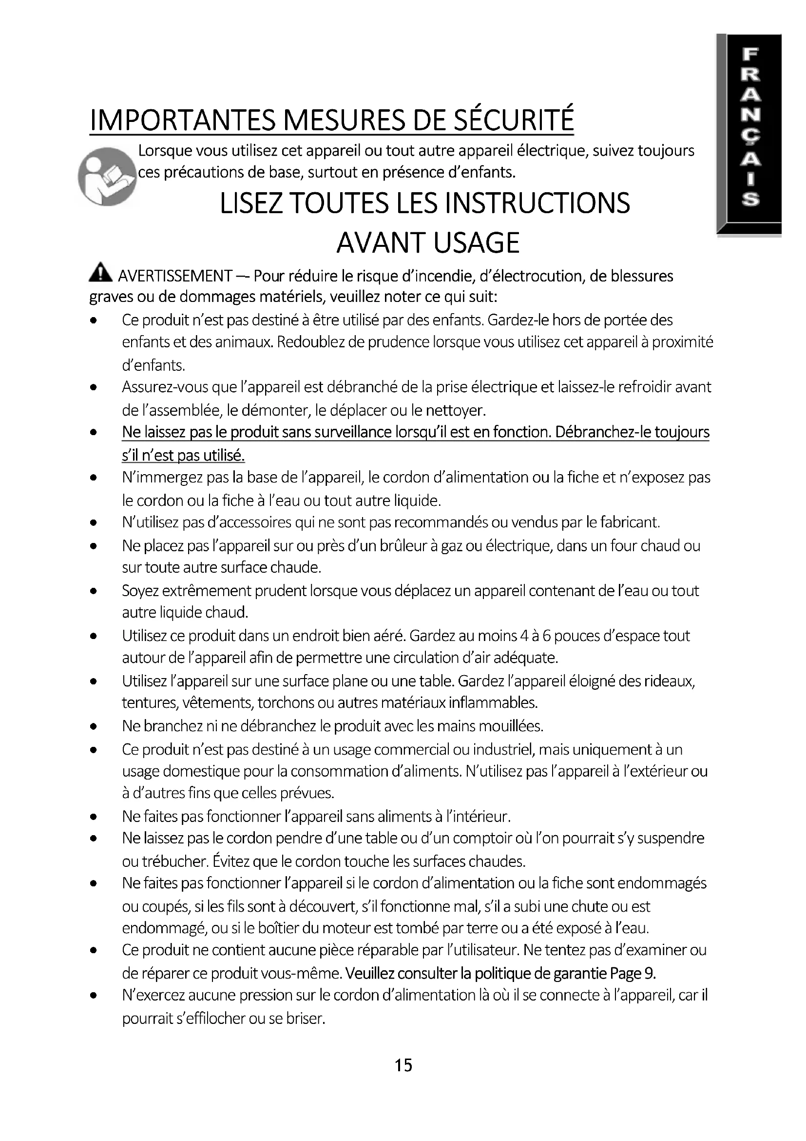 AVANT USAGE AVERTISSEMENT –- Pour réduire le risque d’incendie, d’électrocution, de blessures graves ou de dommages matériels, veuillez noter ce qui suit: