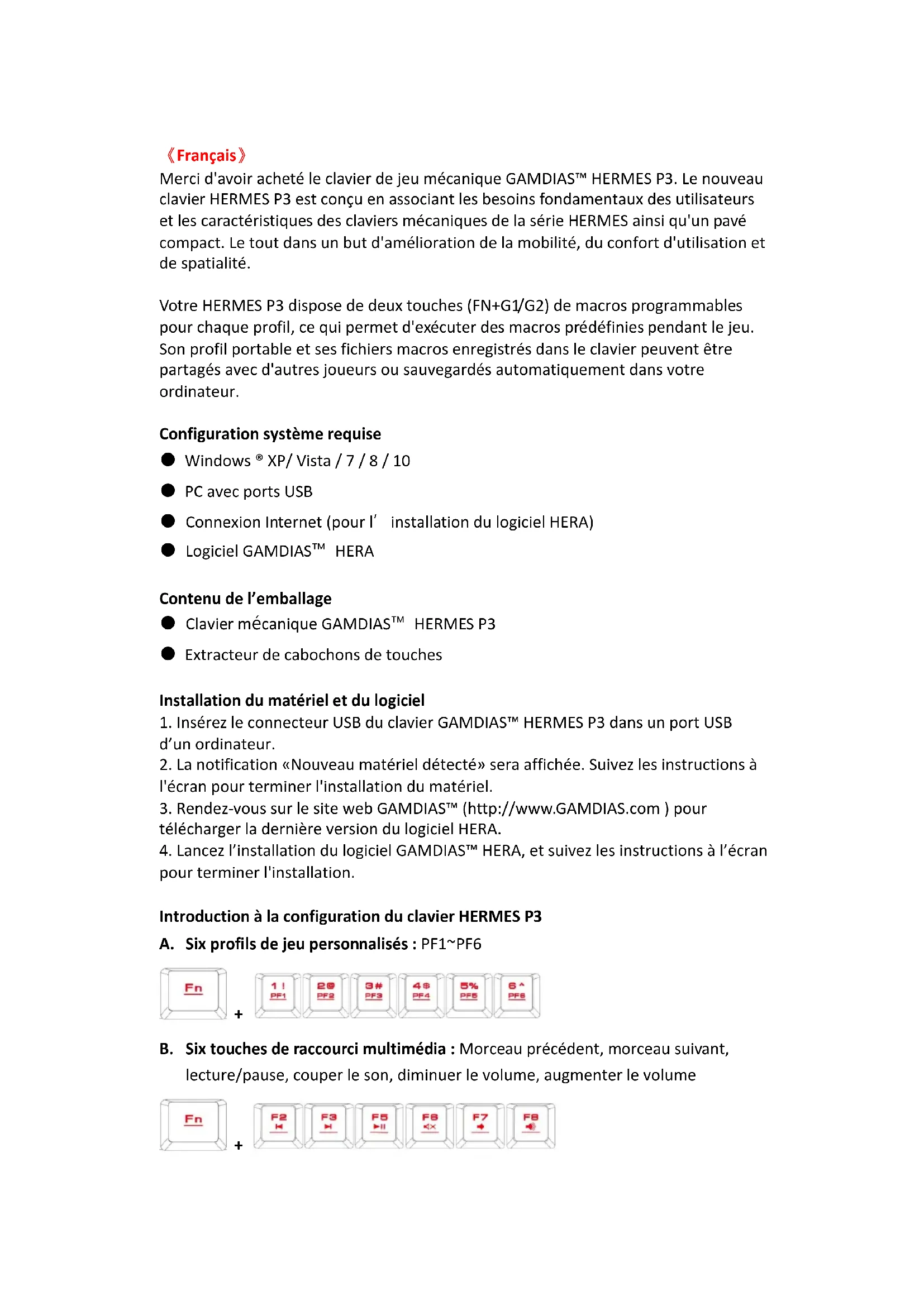 Merci d'avoir acheté le clavier de jeu mécanique GAMDIAS™ HERMES P3. Le nouveau clavier HERMES P3 est conçu en associant les besoins fondamentaux des utilisateurs et les caractéristiques des claviers mécaniques de la série HERMES ainsi qu'un pavé compact. Le tout dans un but d'amélioration de la mobilité, du confort d'utilisation et de spatialité. Votre HERMES P3 dispose de deux touches (FN+G1/G2) de macros programmables pour chaque profil, ce qui permet d'exécuter des macros prédéfinies pendant le jeu. Son profil portable et ses fichiers macros enregistrés dans le clavier peuvent être partagés avec d'autres joueurs ou sauvegardés automatiquement dans votre ordinateur. Configuration système requise ● Windows ® XP/ Vista / 7 / 8 / 10 ● PC avec ports USB ● Connexion Internet (pour l’installation du logiciel HERA) ● Logiciel GAMDIAS™ HERA Contenu de l’emballage ● Clavier mécanique GAMDIAS™ HERMES P3 ● Extracteur de cabochons de touches Installation du matériel et du logiciel