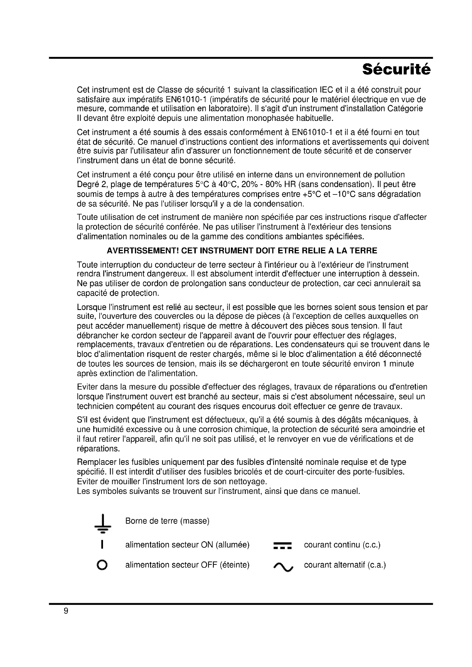 Sécurité Cet instrument est de Classe de sécurité 1 suivant la classification IEC et il a été construit pour satisfaire aux impératifs EN61010-1 (impératifs de sécurité pour le matériel électrique en vue de mesure, commande et utilisation en laboratoire). Il s'agit d'un instrument d'installation Catégorie II devant être exploité depuis une alimentation monophasée habituelle. Cet instrument a été soumis à des essais conformément à EN61010-1 et il a été fourni en tout état de sécurité. Ce manuel d'instructions contient des informations et avertissements qui doivent être suivis par l'utilisateur afin d'assurer un fonctionnement de toute sécurité et de conserver l'instrument dans un état de bonne sécurité. Cet instrument a été conçu pour être utilisé en interne dans un environnement de pollution Degré 2, plage de températures 5°C à 40°C, 20% - 80% HR (sans condensation). Il peut être soumis de temps à autre à des températures comprises entre +5°C et –10°C sans dégradation de sa sécurité. Ne pas l'utiliser lorsqu'il y a de la condensation. Toute utilisation de cet instrument de manière non spécifiée par ces instructions risque d'affecter la protection de sécurité conférée. Ne pas utiliser l'instrument à l'extérieur des tensions d'alimentation nominales ou de la gamme des conditions ambiantes spécifiées. AVERTISSEMENT! CET INSTRUMENT DOIT ETRE RELIE A LA TERRE Toute interruption du conducteur de terre secteur à l'intérieur ou à l'extérieur de l'instrument rendra l'instrument dangereux. Il est absolument interdit d'effectuer une interruption à dessein. Ne pas utiliser de cordon de prolongation sans conducteur de protection, car ceci annulerait sa capacité de protection. Lorsque l'instrument est relié au secteur, il est possible que les bornes soient sous tension et par suite, l'ouverture des couvercles ou la dépose de pièces (à l'exception de celles auxquelles on peut accéder manuellement) risque de mettre à découvert des pièces sous tension. Il faut débrancher ke cordon secteur de l'appareil avant de l'ouvrir pour effectuer des réglages, remplacements, travaux d'entretien ou de réparations. Les condensateurs qui se trouvent dans le bloc d'alimentation risquent de rester chargés, même si le bloc d'alimentation a été déconnecté de toutes les sources de tension, mais ils se déchargeront en toute sécurité environ 1 minute après extinction de l'alimentation. Eviter dans la mesure du possible d'effectuer des réglages, travaux de réparations ou d'entretien lorsque l'instrument ouvert est branché au secteur, mais si c'est absolument nécessaire, seul un technicien compétent au courant des risques encourus doit effectuer ce genre de travaux. S'il est évident que l'instrument est défectueux, qu'il a été soumis à des dégâts mécaniques, à une humidité excessive ou à une corrosion chimique, la protection de sécurité sera amoindrie et il faut retirer l'appareil, afin qu'il ne soit pas utilisé, et le renvoyer en vue de vérifications et de réparations. Remplacer les fusibles uniquement par des fusibles d'intensité nominale requise et de type spécifié. Il est interdit d'utiliser des fusibles bricolés et de court-circuiter des porte-fusibles. Eviter de mouiller l'instrument lors de son nettoyage. Les symboles suivants se trouvent sur l'instrument, ainsi que dans ce manuel.