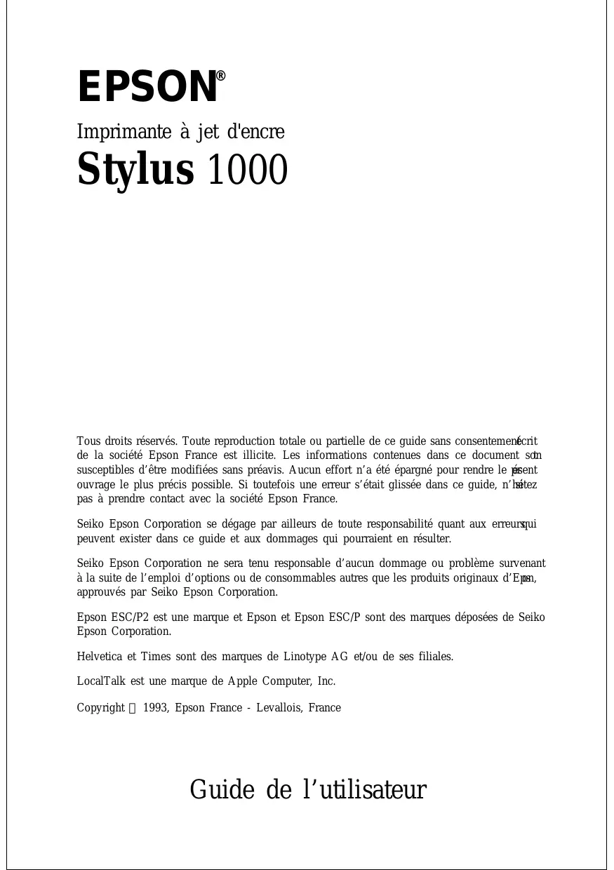 EPSON Imprimante à jet d'encre Stylus 1000 Tous droits réservés. Toute reproduction totale ou partielle de ce guide sans consentementécrit de la société Epson France est illicite. Les informations contenues dans ce document son susceptibles d’être modifiées sans préavis. Aucun effort n’a été épargné pour rendre le pr ésent ouvrage le plus précis possible. Si toutefois une erreur s’était glissée dans ce guide, n’hé sitez pas à prendre contact avec la société Epson France. Seiko Epson Corporation se dégage par ailleurs de toute responsabilité quant aux erreursqui peuvent exister dans ce guide et aux dommages qui pourraient en résulter. Seiko Epson Corporation ne sera tenu responsable d’aucun dommage ou problème survenant à la suite de l’emploi d’options ou de consommables autres que les produits originaux d’Eps on, approuvés par Seiko Epson Corporation. Epson ESC/P2 est une marque et Epson et Epson ESC/P sont des marques déposées de Seiko Epson Corporation. Helvetica et Times sont des marques de Linotype AG et/ou de ses filiales. LocalTalk est une marque de Apple Computer, Inc. Copyright 1993, Epson France - Levallois, France Guide de l’utilisateur Consignes de sécurité