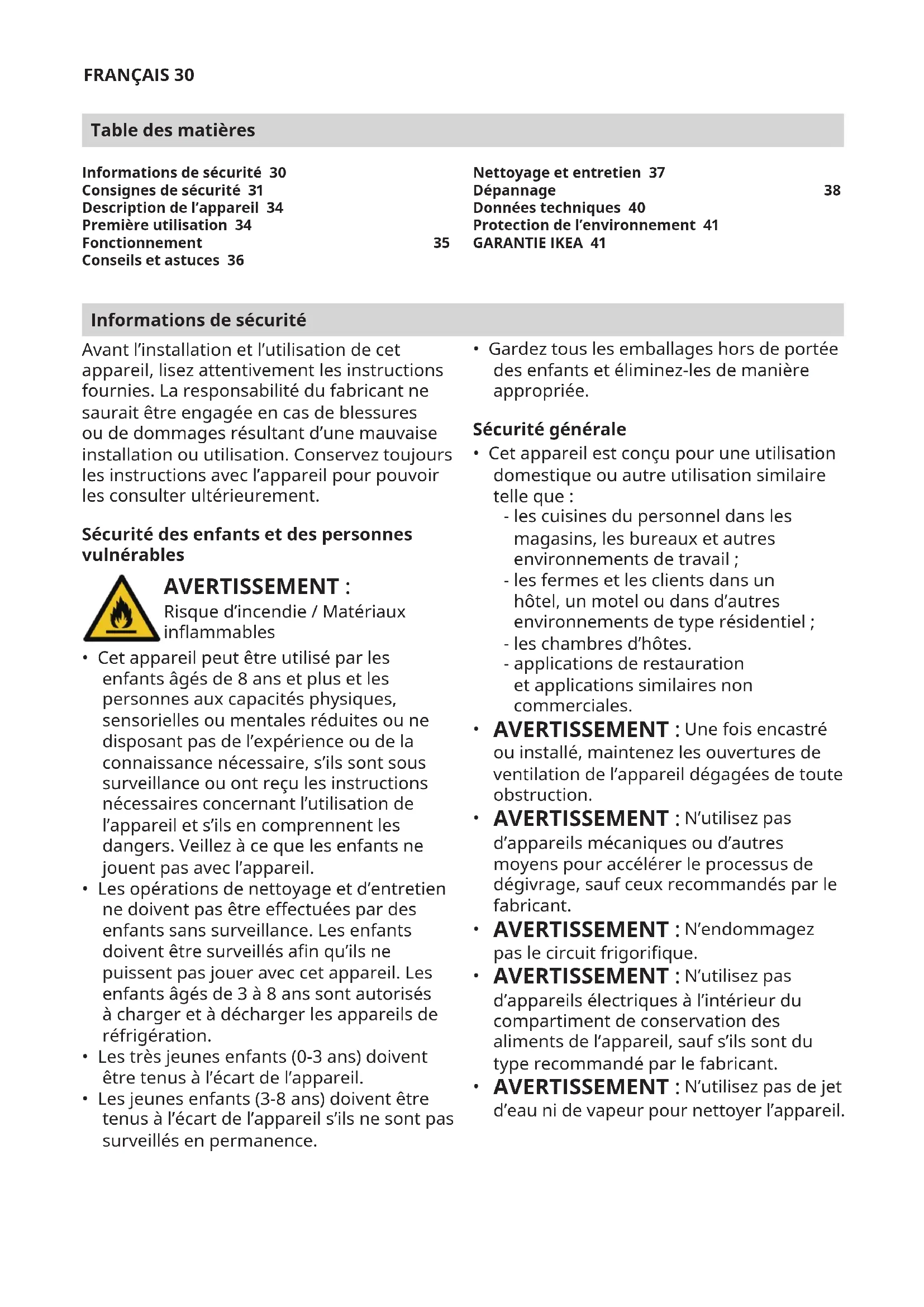 - Demander des précisions au sujet des fonctions des appareils IKEA. An de vous garantir la meilleure assistance possible, nous vous prions de lire attentivement les instructions d’assemblage et le mode d’emploi avant de nous contacter.FRANÇAIS 43 Comment nous joindre en cas de besoin Vous trouverez les numéros de téléphone des prestataires de service après-vente désignés par IKEA à la n de ce manuel. An de vous fournir un service plus rapide, nous vous recommandons d’utiliser les numéros de téléphone spéciques indiqués dans ce manuel. Utilisez toujours les numéros de téléphone indiqués dans le manuel d’utilisation de l’appareil pour lequel vous avez besoin d’aide. N’oubliez pas d’indiquer le numéro d’article à 8chires et le numéro de série à 22chires gurant sur la plaque signalétique de votre appareil. CONSERVEZ VOTRE PREUVE D’ACHAT! La preuve de votre achat est nécessaire pour l’application de la garantie. Le nom et le numéro d’article (code à 8 chires) IKEA de chaque appareil acheté gurent également sur la preuve d’achat. Besoin d’aide supplémentaire? Pour toute autre question non relative au service après-vente de vos appareils, contactez le centre d’appel de votre magasin IKEA. Nous vous recommandons de lire attentivement toute la documentation fournie avec l’appareil avant de nous contacter. Informations sur les pièces détachées - Les pièces détachées suivantes comme les thermostats, capteurs de température, circuits imprimés et sources lumineuses, seront disponibles pour les réparateurs professionnels pendant une période minimale de sept ans, après la mise sur le marché de la dernière unité du modèle. - Les pièces détachées suivantes: poignées de porte, charnières de porte, plateaux et paniers seront disponibles pour les réparateurs professionnels et les utilisateurs naux pendant une période minimale de sept ans, et les joints de porte pendant une période minimale de dix ans, après la mise sur le marché de la dernière unité du modèle. Les pièces détachées peuvent être trouvées à l’adresse suivante: www.ikea.comITALIANO 44 Indice Informazioni per la sicurezza Leggere attentamente le istruzioni fornite prima di installare e utilizzare l'apparecchiatura. Il produttore non è responsabile in caso di lesioni o danni derivanti da un'installazione o un uso impropri dell'apparecchio. Conservare le istruzioni come riferimento futuro. Sicurezza dei bambini e delle persone vulnerabili AVVERTENZA: Rischio di incendio / Materiali inammabili