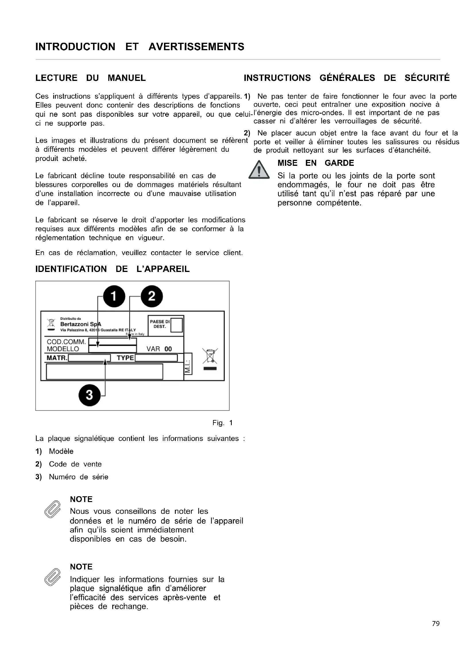 NOTE Nous vous conseillons de noter les données et le numéro de série de l’appareil afin qu’ils soient immédiatement disponibles en cas de besoin. NOTE Indiquer les informations fournies sur la plaque signalétique afin d’améliorer l’efficacité des services après-vente et pièces de rechange. INSTRUCTIONS GÉNÉRALES DE SÉCURITÉ
