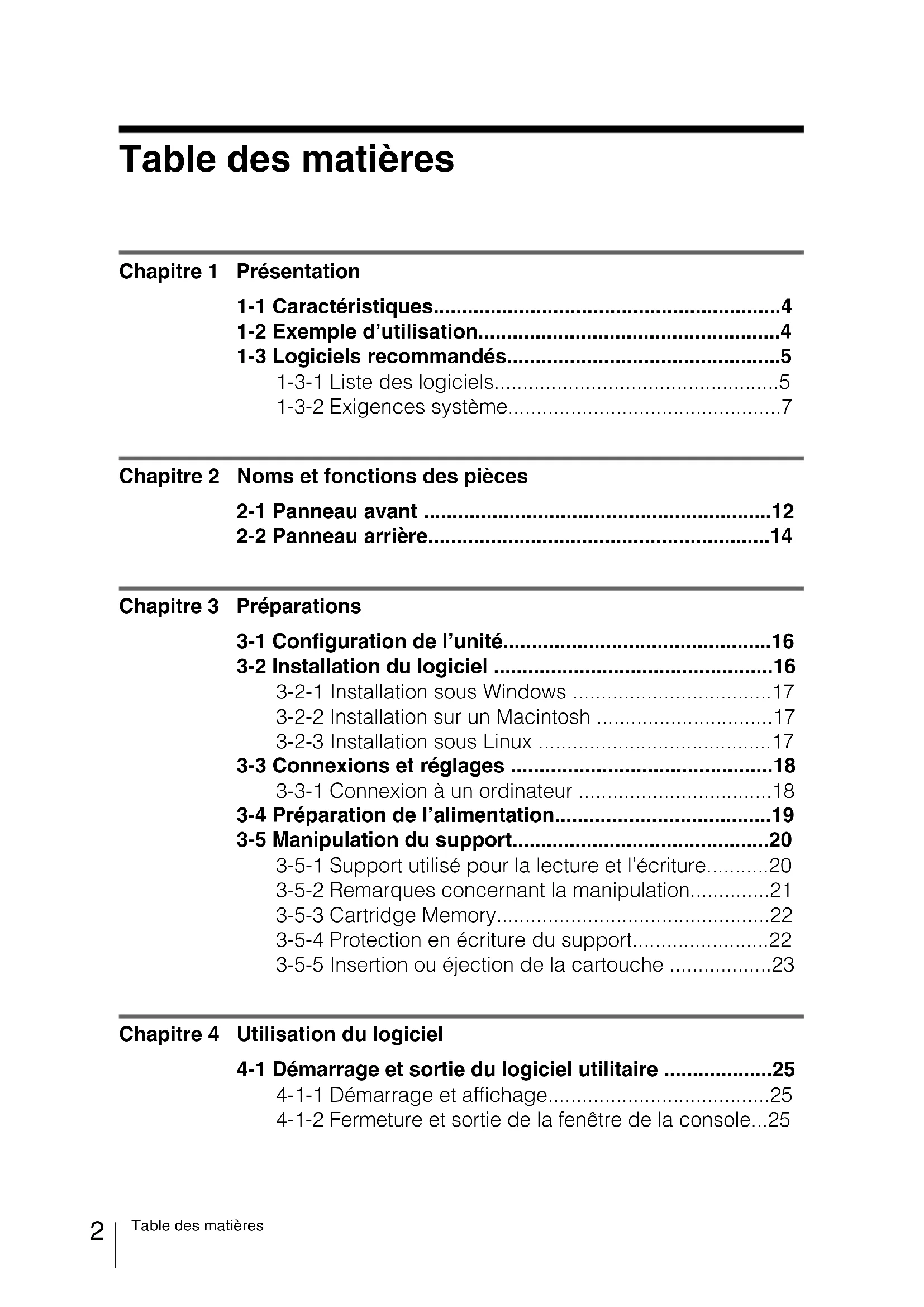 | Content Manager | Windows/ Macintosh | Ce logiciel fournit des fonctions polyvalentes afin de:gérer vos contenus, ce qui vous permet de tirer pleinement profit de l'unité de lecteur d'archives de disque optique. Pour utiliser ce logiciel, vous nevez l'authentifier en faisissant le nombre de série de Content Managerc). Pour de plus amples informations, reportez-vous à l'aide de « Content Manager ». |