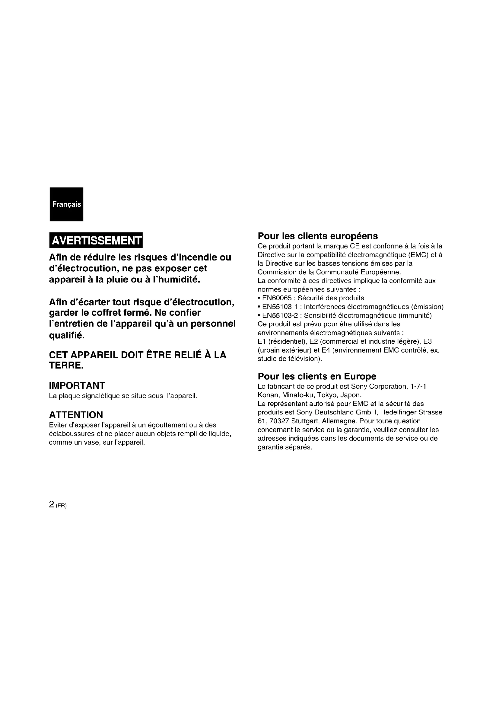TERRE. IMPORTANT La plaque signalétique se situe sous l’appareil. ATTENTION Eviter d’exposer l’appareil à un égouttement ou à des éclaboussures et ne placer aucun objets rempli de liquide, comme un vase, sur l’appareil. Pour les clients européens Ce produit portant la marque CE est conforme à la fois à la Directive sur la compatibilité électromagnétique (EMC) et à la Directive sur les basses tensions émises par la Commission de la Communauté Européenne. La conformité à ces directives implique la conformité aux normes européennes suivantes :