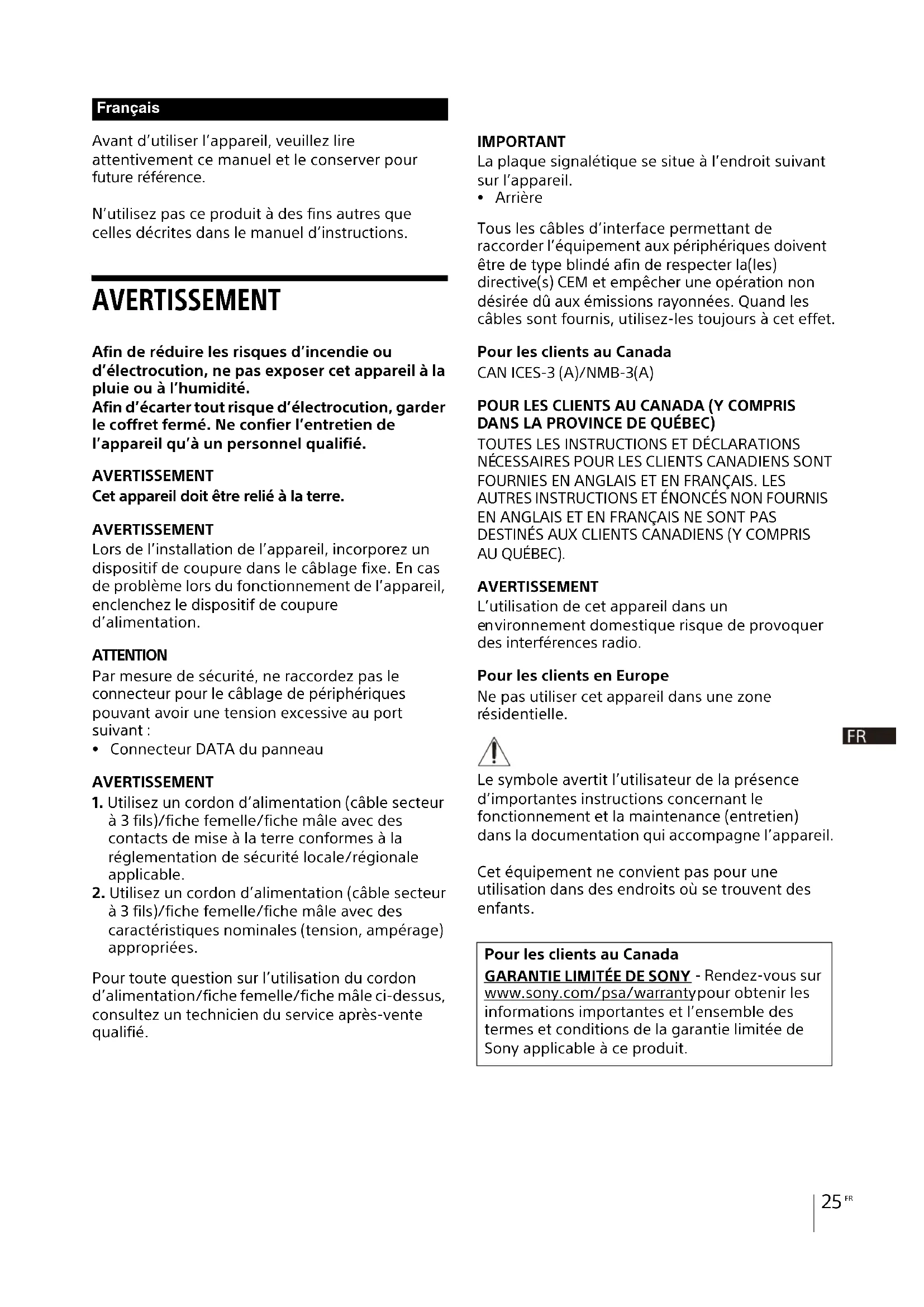 - Rendez-vous sur www.sony.com/psa/warranty pour obtenir les informations importantes et l’ensemble des termes et conditions de la garantie limitée de Sony applicable à ce produit. FrançaisFR