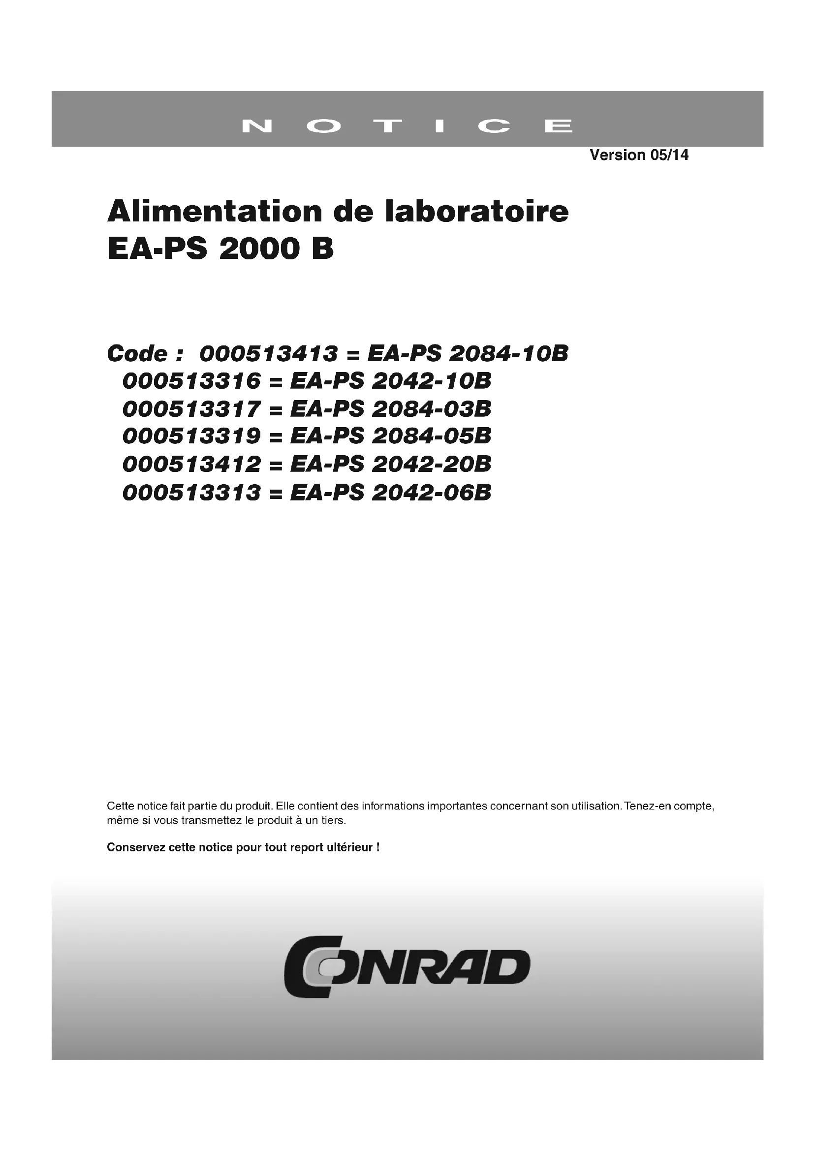Alimentation de laboratoire EA-PS 2000 B Code : 000513413 = EA-PS 2084-10B 000513316 = EA-PS 2042-10B 000513317 = EA-PS 2084-03B 000513319 = EA-PS 2084-05B 000513412 = EA-PS 2042-20B 000513313 = EA-PS 2042-06B Cette notice fait partie du produit. Elle contient des informations importantes concernant son utilisation. Tenez-en compte, même si vous transmettez le produit à un tiers. Conservez cette notice pour tout report ultérieur ! NOTICE Version 05/14Consignes de sécurité - Utilisez l’appareil uniquement avec la tension indiquée. - N’introduisez aucun élément mécanique dans l’appareil par la fente d’aération (notamment des éléments en métal) ! - Evitez d’utiliser des liquides de quelque nature que ce soit à proximité de l’appareil (ils pourraient couler à l’intérieur de l’appareil). - Ne raccordez aucune source de courant à la sortie de l’appareil supérieure à la tension nominale. - Ne raccordez aucune source de courant à la polarité inversée à la sortie de l’appareil. - Après avoir désactivé la sortie ou l’appareil, il se peut que de la tension dangereuse en cas de contact réside au niveau de la sortie, du moins pendant une certaine durée. - Attention ! La partie inférieure du boîtier surchauffe en cas de fonctionnement prolongé à charge élevée.