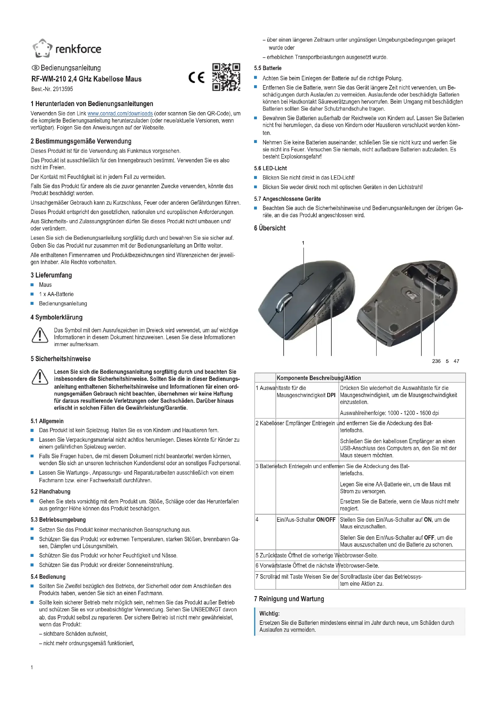 Click on the following link to read the full text of the EU declaration of conformity: www.conrad.com/downloads Enter the product item number in the search box. You can then download the EU declaration of conformity in the available languages. 10 Technical data Battery............................................ 1x 1.5 V AA battery Tracking speed............................... 1000 / 1200 / 1600 dpi Buttons ........................................... 5 + tracking speed Operating system support .............. Windows® 8 and higher; MacOS; Linux Wireless frequency ........................ 2.402 - 2.480 GHz Wireless range ............................... max. 10 m Wireless transmission power ......... 8.241 dBm Operating temperature .................. 0 to +40 °C Operating humidity ........................ 5 - 80 % RH (non-condensing) Storage temperature ...................... -20 to +60 °C Storage humidity ............................ 5 - 80 % RH (non-condensing) Dimensions (W x H x D) (approx.) . 75 x 39 x 109 mm Weight (approx.) ............................ 62 g This is a publication by Conrad Electronic SE, Klaus-Conrad-Str. 1, D-92240 Hirschau (www.conrad.com). All rights including translation reserved. Reproduction by any method (e.g. photocopying, microfilming or the capture in electronic data processing systems) requires prior written approval from the editor. Reprinting, also in part, is prohibited. This publication reflects the technical status at the time of printing. Copyright by Conrad Electronic SE. *2913595_V2_0124_jh_mh_en 36028798180872331-2 I5/O2 en5 Mode d’emploi Souris sans fil RF-WM-210 2,4GHz N° de commande 2913595 1 Mode d'emploi à télécharger Utilisez le lien www.conrad.com/downloads (ou scannez le code QR) pour télécharger le mode d'emploi complet (ou les versions nouvelles/actuelles, le cas échéant). Respectez les instructions indiquées sur la page Web. 2 Utilisation prévue Cet article est destiné à une utilisation comme souris sans fil. Le produit est destiné uniquement à une utilisation à l’intérieur. Ne l'utilisez pas à l’extérieur. Dans tous les cas, le contact avec l’humidité doit être évité. Toute utilisation à des fins autres que celles décrites pourrait endommager le produit. Une mauvaise utilisation peut entraîner des risques tels que des courts-circuits, des incen- dies, etc. Ce produit est conforme aux exigences nationales et européennes en vigueur. Pour des raisons de sécurité et d’homologation, toute restructuration et/ou modification du produit est interdite. Lisez attentivement les instructions du mode d’emploi et conservez-le dans un endroit sûr. Ne mettez ce produit à la disposition de tiers qu’avec son mode d’emploi. Tous les noms d’entreprises et appellations de produits sont des marques commerciales de leurs propriétaires respectifs. Tous droits réservés. 3 Contenu d'emballage