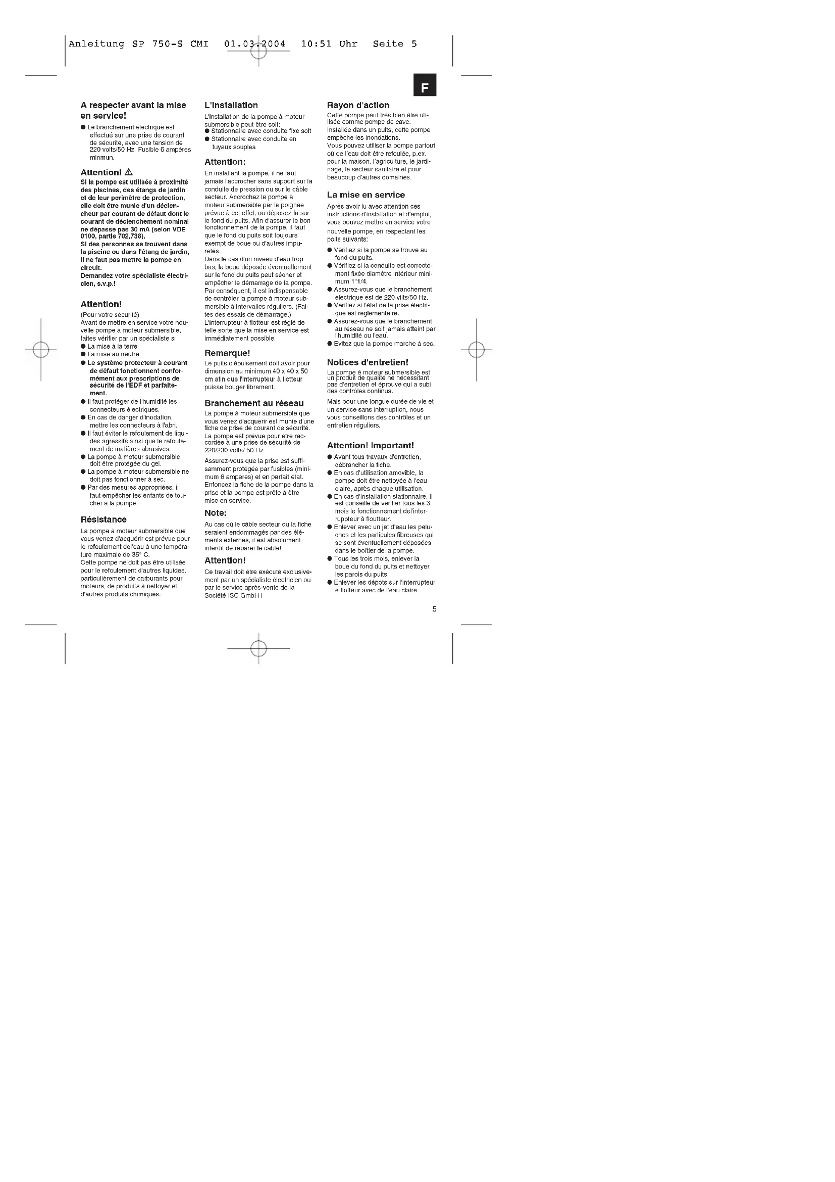 Förderhöhe Fördermenge 2 m max.: 13.000 l/h4 m max.: 9.800 l/h6 m max.: 5.300 l/h Anleitung SP 750-S CMI 01.03.2004 10:51 Uhr Seite 45 A respecter avant la mise en service! ● Le branchement électrique esteffectué sur une prise de courantde sécurité, avec une tension de220 volts/50 Hz. Fusible 6 ampéresminmun. Attention! Si la pompe est utilisée à proximitédes piscines, des étangs de jardinet de leur perimètre de protection,elle doit être munie d'un déclen-cheur par courant de défaut dont lecourant de déclenchement nominalne dépasse pas 30 mA (selon VDE0100, partie 702,738).Si des personnes se trouvent dansla piscine ou dans l'étang de jardin,il ne faut pas mettre la pompe encircuit.Demandez votre spécialiste électri-cien, s.v.p.! Attention! (Pour votre sécurité) Avant de mettre en service votre nou-velle pompe à moteur submersible,faites vérifier par un spécialiste si● La mise à la terre● La mise au neutre● Le système protecteur à courantde défaut fonctionnent confor-mément aux prescriptions desécurité de l'EDF et parfaite-ment.● Il faut protéger de l'humidité lesconnecteurs électriques.● En cas de danger d'inodation,mettre les connecteurs à l'abri.● Il faut éviter le refoulement de liqui-des agressifs ainsi que le refoule-ment de matières abrasives.● La pompe à moteur submersibledoit être protégée du gel.● La pompe à moteur submersible nedoit pas fonctionner à sec.● Par des mesures appropriées, ilfaut empêcher les enfants de tou-cher à la pompe. Résistance La pompe à moteur submersible quevous venez d'acquérir est prévue pourle refoulement del'eau à une tempéra-ture maximale de 35° C.Cette pompe ne doit pas être utiliséepour le refoulement d'autres liquides,particulièrement de carburants pourmoteurs, de produits à nettoyer etd'autres produits chimiques. Rayon d'action Cette pompe peut trés bien être uti-lisée comme pompe de cave.Installée dans un puits, cette pompeempêche les inondations.Vous pouvez utiliser la pompe partoutoù de l’eau doit être refoulée, p.ex.pour la maison, l’agriculture, le jardi-nage, le secteur sanitaire et pourbeaucoup d’autres domaines. La mise en service Après avoir lu avec attention cesinstructions d'installation et d'emploi,vous pouvez mettre en service votrenouvelle pompe, en respectant lespoits suivants:● Vérifiez si la pompe se trouve aufond du puits.● Vérifiez si la conduite est correcte-ment fixée diamétre intérieur mini-mum 1"1/4.● Assurez-vous que le branchementélectrique est de 220 vilts/50 Hz.● Vérifiez si l'état de la prise électri-que est reglementaire.● Assurez-vous que le branchementau réseau ne soit jamais atteint parl'humidité ou l'eau.● Evitez que la pompe marche à sec. Notices d'entretien! La pompe é moteur submersible estun produit de qualité ne nécessitantpas d'entretien et éprouvé qui a subides contrôles continus.Mais pour une longue durée de vie etun service sans interruption, nousvous conseillons des contrôles et unentretien réguliers. Attention! Important! ● Avant tous travaux d'entretien,débrancher la fiche.● En cas d'utilisation amovible, lapompe doit être nettoyée à l'eauclaire, après chaque utilisation.● En cas d'installation stationnaire, ilest conseillé de vérifier tous les 3mois le fonctionnement del'inter-ruppteur à floutteur.● Enlever avec un jet d'eau les pelu-ches et les particules fibreuses quise sont éventuellement déposéesdans le boîtier de la pompe.● Tous les trois mois, enlever laboue du fond du puits et nettoyerles parois du puits.● Enlever les dépots sur l'interrupteuré flotteur avec de l'eau claire. L'installation L'installation de la pompe à moteursubmersible peut être soit:● Stationnaire avec conduite fixe soit● Stationnaire avec conduite entuyaux souples Attention: En installant la pompe, il ne fautjamais l'accrocher sans support sur laconduite de pression ou sur le câblesecteur. Accrochez la pompe àmoteur submersible par la poignéeprévue à cet effet, ou déposez-la surle fond du puits. Afin d'assurer le bonfonctionnement de la pompe, il fautque le fond du puits soit toujoursexempt de boue ou d'autres impu-retés. Dans le cas d'un niveau d'eau tropbas, la boue déposée éventuellementsur le fond du puits peut sécher etempêcher le démarrage de la pompe.Par conséquent, il est indispensablede contrôler la pompe à moteur sub-mersible à intervalles réguliers. (Fai-tes des essais de démarrage.)L'interrupteur à flotteur est réglé detelle sorte que la mise en service estimmédiatement possible. Remarque! Le puits d'épuisement doit avoir pourdimension au minimum 40 x 40 x 50cm afin que l'interrupteur à flotteurpuisse bouger librement. Branchement au réseau La pompe à moteur submersible quevous venez d'acquerir est munie d'unefiche de prise de courant de sécurité.La pompe est prévue pour être rac-cordée à une prise de sécurité de220/230 volts/ 50 Hz.Assurez-vous que la prise est suffi-samment protégée par fusibles (mini-mum 6 ampères) et en partait état.Enfoncez la fiche de la pompe dans laprise et la pompe est prête à êtremise en service. Note: Au cas où le câble secteur ou la ficheseraient endommagés par des élé-ments externes, il est absolumentinterdit de réparer le câble! Attention! Ce travail doit être exécuté exclusive-ment par un spécialiste électricien oupar le service après-vente de laSociété ISC GmbH !