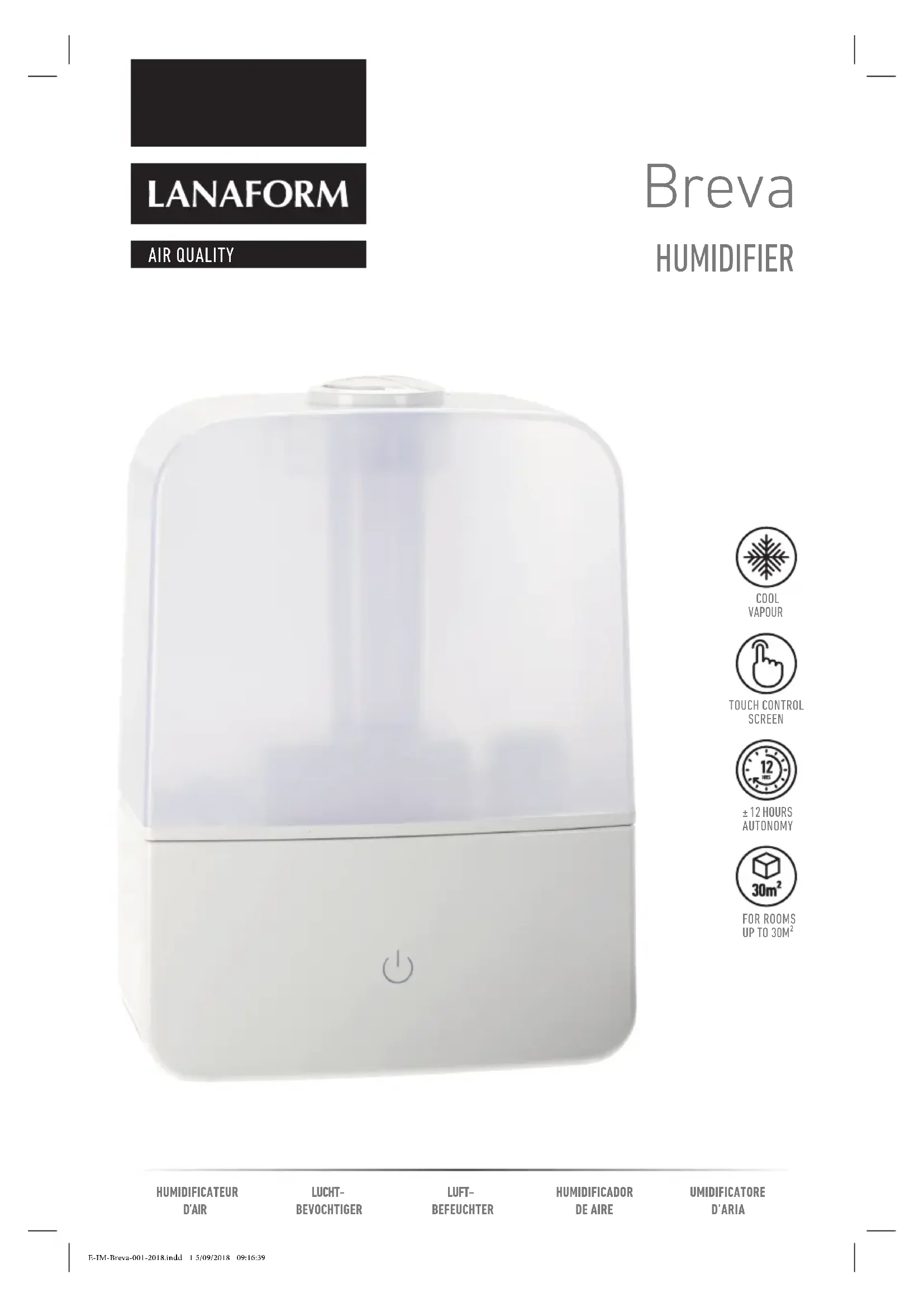 LANAFORM garantit que ce produit est exempt de tout vice de matériau et de fa- brication à compter de sa date d’achat et ce pour une période de deux ans, à l’excep- tion des précisions ci-dessous. La garantie LANAFORM ne couvre pas les dommages causés suite à une usure nor- male de ce produit. En outre, la garantie sur ce produit LANAFORM ne couvre pas les dommages causés à la suite de toute utili- sation abusive ou inappropriée ou encore de tout mauvais usage, accident, xation de tout accessoire non autorisé, modica- tion apportée au produit ou de toute autre condition, de quelle que nature que ce soit, échappant au contrôle de LANAFORM. LANAFORM ne sera pas tenue pour respon- sable de tout type de dommage accessoire, consécutif ou spécial. Toutes les garanties implicites d’aptitude du produit sont limitées à une période de deux années à compter de la date d’achat initiale pour autant qu’une copie de la preuve d’achat puisse être présentée. Dès réception, LANAFORM réparera ou remplacera, suivant le cas, votre appareil et vous le renverra. La garantie n’est eec- tuée que par le biais du Centre Service de LANAFORM. Toute activité d’entretien de ce produit conée à toute personne autre que le Centre Service de LANAFORM annule la présente garantie. NEDERLANDS INLEIDING Hartelijk dank voor uw aankoop van de bevochtiger met koude damp Breva van LANAFORM. De bevochtiger Breva helpt u een geschikte luchtvochtigheidsgraad te bereiken en de ongemakken door een te droge lucht te voorkomen. Het ventila- tiesysteem verspreidt het water in de vorm van koude damp om de gewenste vochtig- heidsgraad te bereiken.