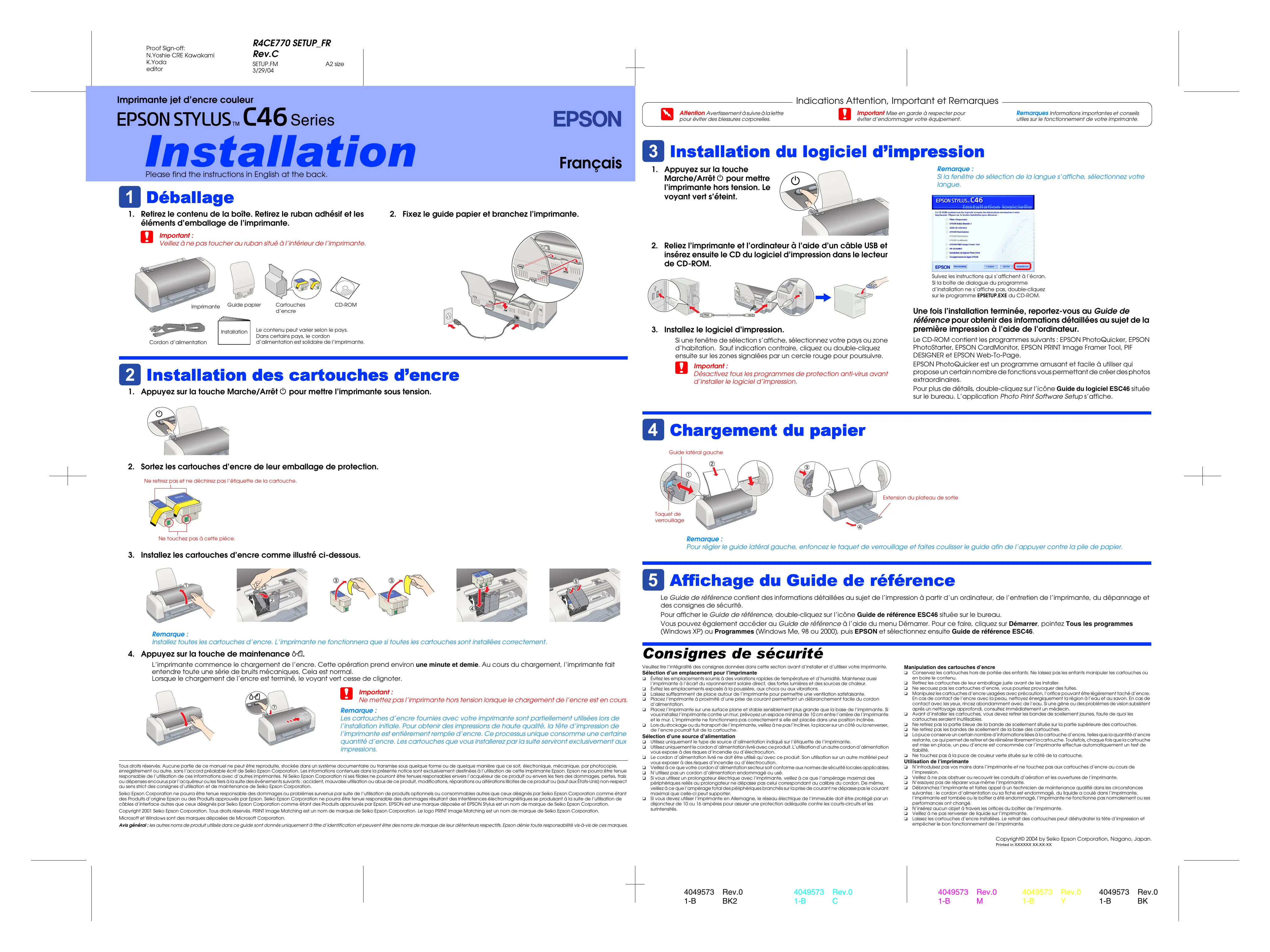 insérez ensuite le CD du logiciel d’impression dans le lecteur de CD-ROM. Suivez les instructions qui s’affichent à l’écran. Si la boîte de dialogue du programme d’installation ne s’affiche pas, double-cliquez sur le programme EPSETUP.EXE du CD-ROM. Imprimante Guide papier Installation Cordon d’alimentation Cartouches d’encre CD-ROM Une fois l’installation terminée, reportez-vous au Guide de référence pour obtenir des informations détaillées au sujet de la première impression à l’aide de l’ordinateur.