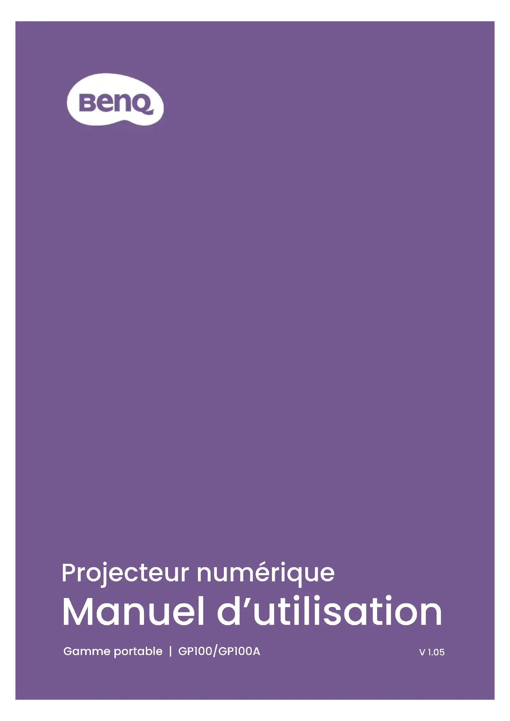 Manuel d’utilisation V 1.05 Projecteur numérique Gamme portable | GP100/GP100A2 Assistance produit Il est fortement recommandé de mettre le produit à niveau avec la dernière version du micrologiciel et de consulter le manuel d’utilisation le plus récent pour utiliser au mieux le produit. Ce document vise à fournir les informations les plus à jour et exactes aux clients, et donc tout le contenu peut être modié de temps à autre sans préavis. Veuillez consulter le site Web pour obtenir la dernière version de ce document et d’autres informations sur les produits. Les chiers disponibles varient selon les modèles.