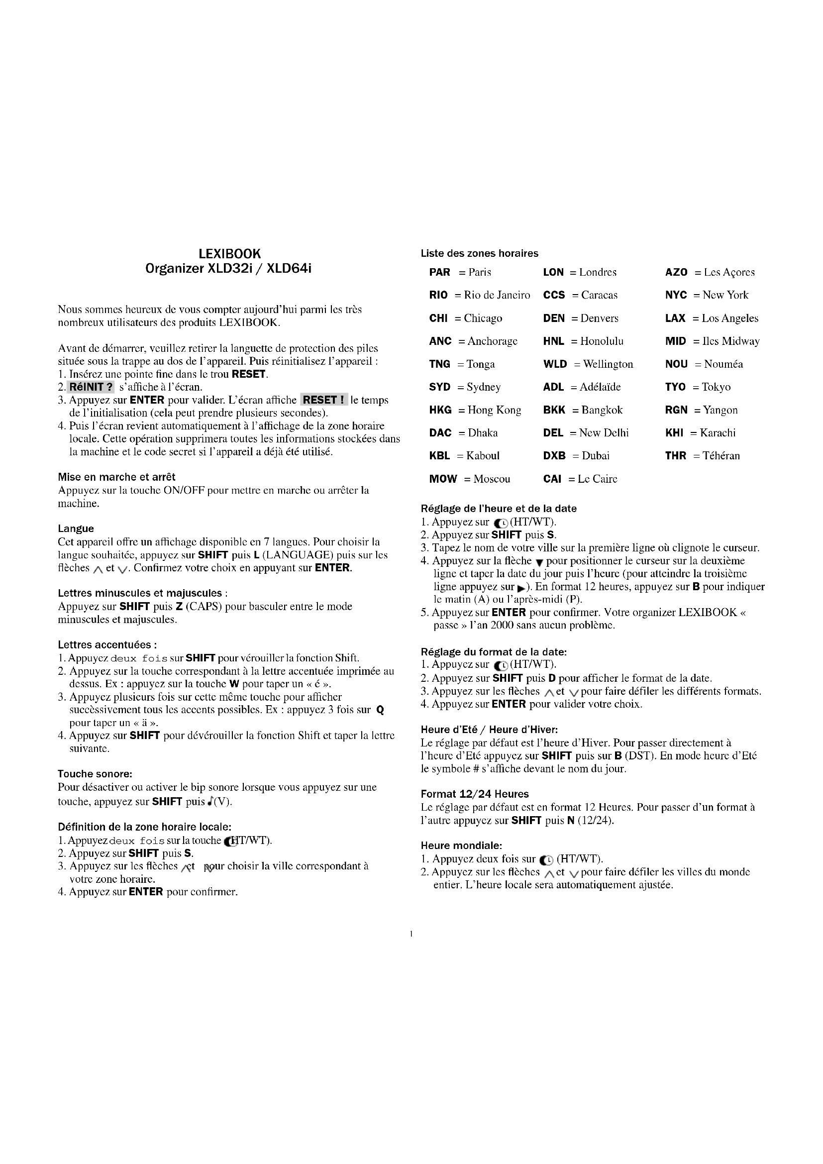 LEXIBOOK Organizer XLD32i / XLD64i Nous sommes heureux de vous compter aujourd’hui parmi les très nombreux utilisateurs des produits LEXIBOOK. Avant de démarrer, veuillez retirer la languette de protection des piles située sous la trappe au dos de l’appareil. Puis réinitialisez l’appareil :