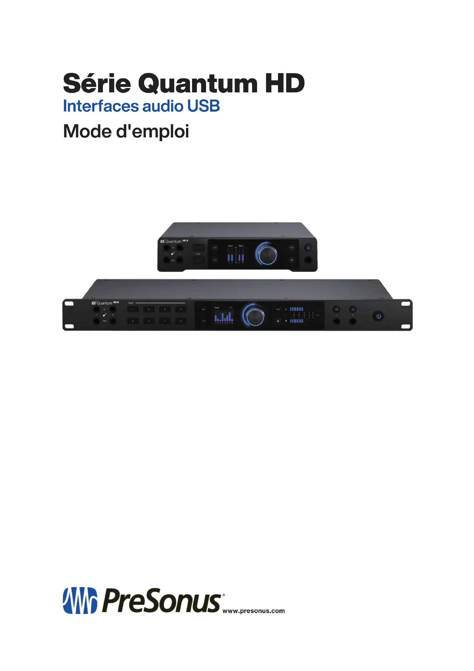 Merci d’avoir acheté l'interface audio QuantumHD PreSonus! Les interfaces QuantumHD permettent une capture sonore sans égale grâce aux préamplis microphones MAX-HD de nouvelle génération, contrôlables à distance, au design industriel haut de gamme et à l'intégration sans pareille des stations de travail audio numériques. Il vous suffit d’un ordinateur à connexion USB, de quelques microphones et câbles, d'enceintes amplifiées, de votre instrument et de votre créativité: vous serez alors prêt à enregistrer, mixer et commercialiser votre musique. N’hésitez pas à nous contacter si vous avez des questions ou commentaires concernant votre interface PreSonus QuantumHD. PreSonus Audio Electronics vise à constamment améliorer ses produits et nous apprécions grandement vos suggestions. Nous vous sommes reconnaissants du soutien que vous nous témoignez au travers de l'achat de ce produit et sommes persuadés que vous apprécierez votre interface Quantum! À propos de ce mode d'emploi: nous vous suggérons d'utiliser ce mode d'emploi pour vous familiariser avec les fonctions, applications et procédures correctes de connexion de votre interface Quantum avant d'essayer de la brancher à votre ordinateur. Cela vous aidera à éviter des problèmes durant l'installation et la configuration. Ce mode d'emploi couvre le fonctionnement de la QuantumHD2 et de la QuantumHD8. Chaque fois qu'une différence fonctionnelle est décrite, les fonctions de la QuantumHD8 apparaissent en premier, suivies par celles de la QuantumHD2.