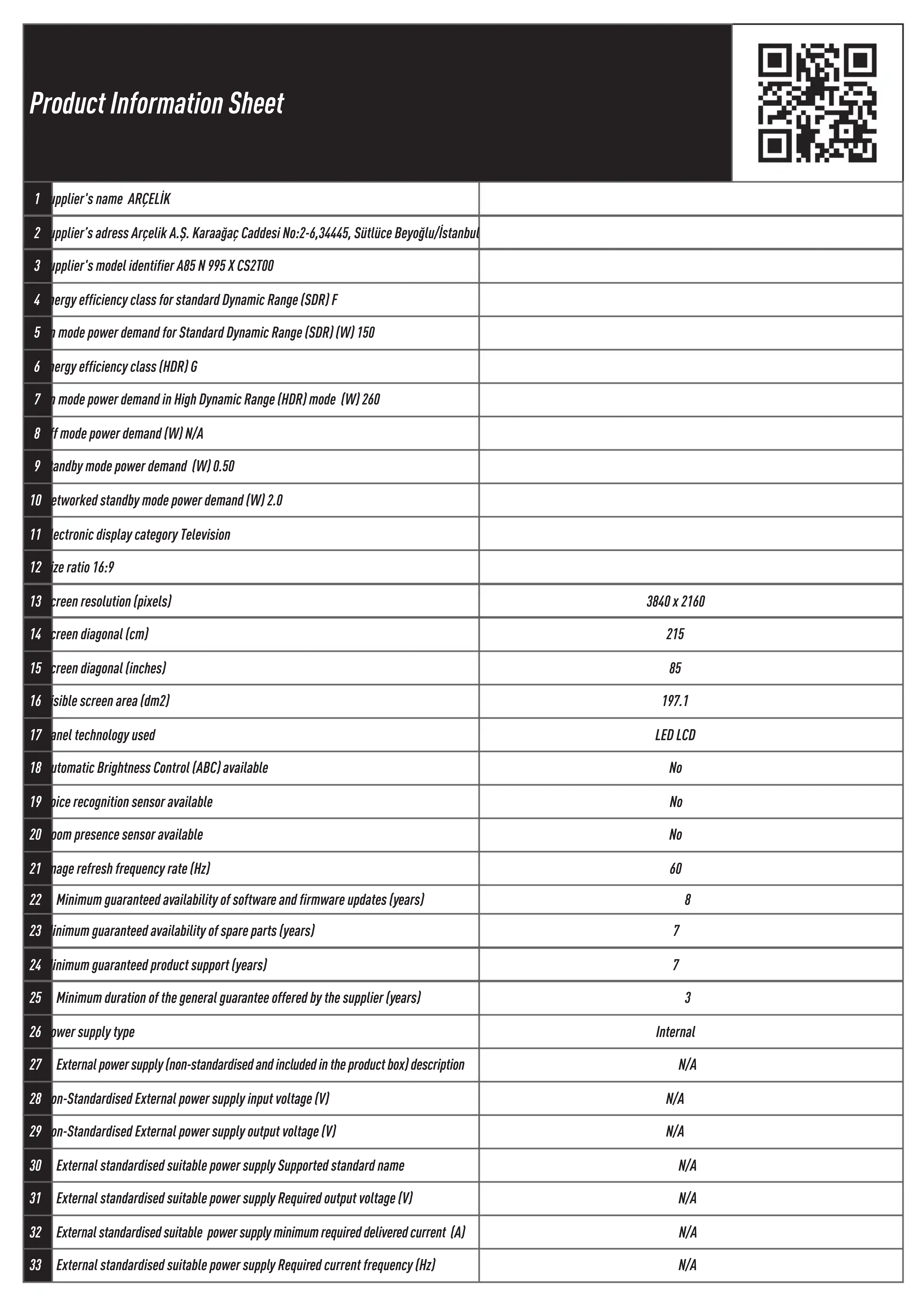 A85 N 995 X - Téléviseur Arçelik - Notice d'utilisation et mode d'emploi gratuit