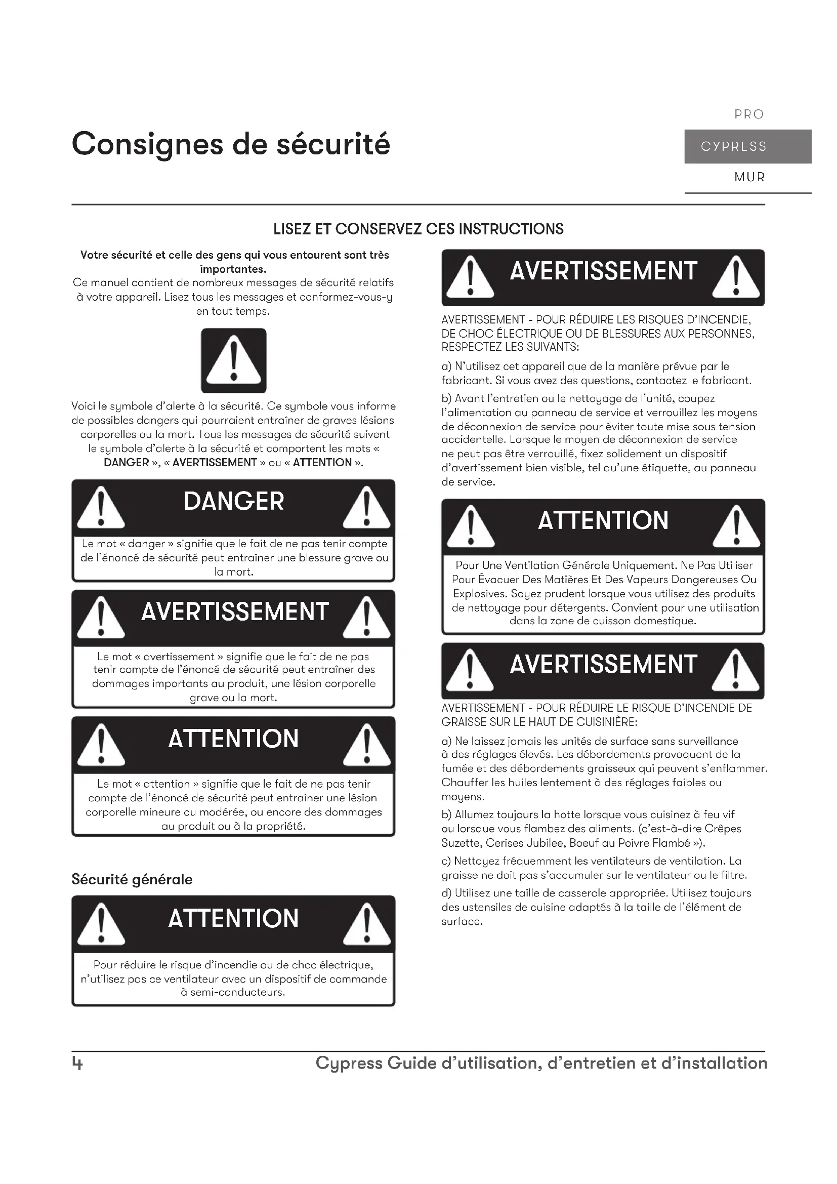 AVERTISSEMENT AVERTISSEMENT - POUR RÉDUIRE LE RISQUE DE BLESSURE DES PERSONNES EN CAS D’INCENDIE DE GRAISSE SUR LE HAUT DE LA CUISINIÈRE, RESPECTEZ CE QUI SUIT:a) DES FLAMMES PLUS INTELLIGENTES avec un couvercle bien ajusté, une plaque à biscuits ou un plateau en métal, puis éteignez le brûleur. FAITES ATTENTION À ÉVITER LES BRÛLURES. Si les flammes ne s’éteignent pas immédiatement, ÉVACUER ET APPELER LE DÉPARTEMENT DES INCENDIES.b) NE JAMAIS RAMASSER UNE PLAQUE ENFLAMME - Vous pourriez être brûlé.c) N’UTILISEZ PAS D’EAU, ni de torchons ou de serviettes humides - une violente explosion de vapeur en résultera.d) Utilisez un extincteur UNIQUEMENT si:1) Vous savez que vous possédez un extincteur de classe ABC et vous savez déjà comment l’utiliser. 2) Le feu est petit et contenu dans la zone où il a commencé. 3) Le service d’incendie est appelé. 4) Vous pouvez combattre le feu dos à une sortieBasé sur “Kitchen Firesafety Tips” publié par la NFPA. AVERTISSEMENT AVERTISSEMENT - POUR RÉDUIRE LES RISQUES D’INCENDIE, DE DÉCHARGE ÉLECTRIQUE OU DE BLESSURES AUX PERSONNES, RESPECTEZ CE QUI SUIT:a) Les travaux d’installation et le câblage électrique doivent être eectués par des personnes qualifiées conformément à tous les codes et normes applicables, y compris la construction résistant au feu.b) Une quantité d’air susante est nécessaire pour une combustion et une évacuation correctes des gaz par le conduit de fumée (cheminée) de l’équipement à combustible pour empêcher le refoulement. Suivez les directives et les normes de sécurité du fabricant de l’équipement de chauage, telles que celles publiées par la National Fire Protection Association (NFPA), l’American Society for Heating, Refrigeration and Air Conditioning Engineers (ASHRAE) et les autorités locales du code.c) Lorsque vous coupez ou percez dans un mur ou un plafond, n’endommagez pas le câblage électrique et les autres services publics cachés.d) Les ventilateurs à conduit doivent toujours être ventilés vers l’extérieur.e) Si cet appareil doit être installé au-dessus d’une baignoire ou d’une douche, il doit être marqué comme approprié pour l’application et être connecté à un circuit de dérivation protégé par un disjoncteur de fuite à la terre (GFCI). AVERTISSEMENT AVERTISSEMENTPOUR RÉDUIRE LES RISQUES D’INCENDIE, UTILISEZ UNIQUEMENT DES CONDUITS MÉTALLIQUES. ATTENTION Pour réduire les risques d’incendie et pour évacuer correctement l’air extérieur, ne pas évacuer l’air évacué dans les espaces à l’intérieur des murs, plafonds, greniers, vides sanitaires ou garages. AVERTISSEMENT Prop. 65 Avertissement pour les résidents de Californie: Ce produit peut contenir des produits chimiques reconnus par l’État de Californie comme pouvant provoquer le cancer, des malformations congénitales ou d’autres troubles de la reproduction.6 Cypress Guide d’utilisation, d’entretien et d’installation CYPRESS MUR PRO Consignes de sécurité