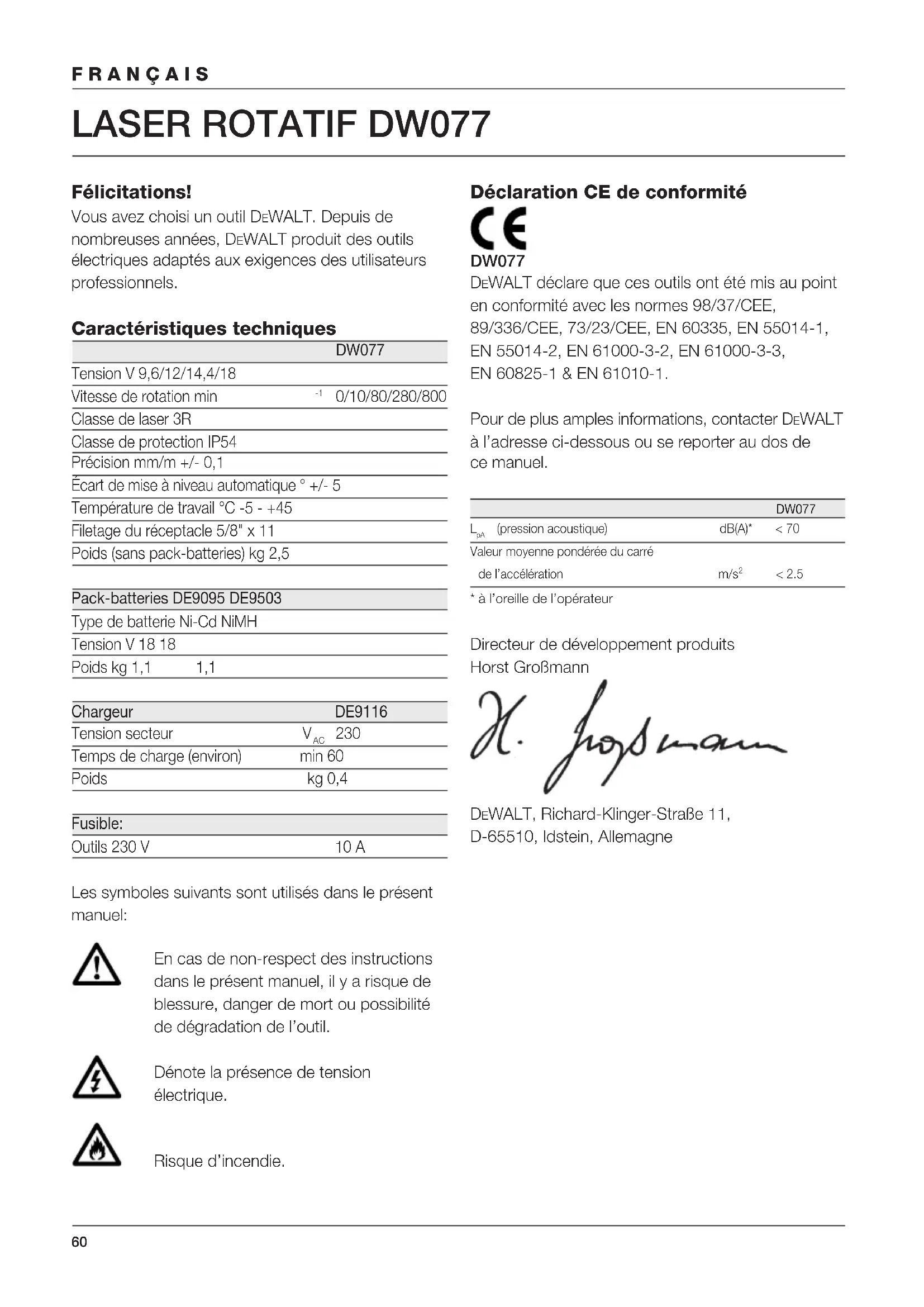 Temps de charge (environ) min 60 Poids kg 0,4 Fusible: Outils 230 V 10 A Les symboles suivants sont utilisés dans le présent manuel: En cas de non-respect des instructions dans le présent manuel, il y a risque de blessure, danger de mort ou possibilité de dégradation de l’outil. Dénote la présence de tension électrique. Risque d’incendie. Déclaration CE de conformité DW077 DEWALT déclare que ces outils ont été mis au point en conformité avec les normes 98/37/CEE, 89/336/CEE, 73/23/CEE, EN 60335, EN 55014-1, EN 55014-2, EN 61000-3-2, EN 61000-3-3, EN 60825-1 & EN 61010-1. Pour de plus amples informations, contacter DEWALT à l’adresse ci-dessous ou se reporter au dos de ce manuel. DW077