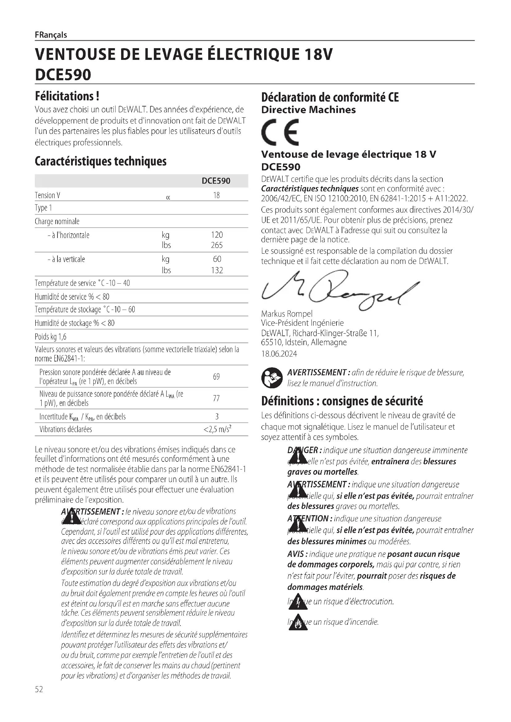 Définitions : consignes de sécurité Les définitions ci-dessous décrivent le niveau de gravité de chaque mot signalétique. Lisez le manuel de l’utilisateur et soyez attentif à cessymboles. DANGER : indique une situation dangereuse imminente qui, si elle n’est pas évitée, entraînera des blessures graves oumortelles. AVERTISSEMENT : indique une situation dangereuse potentielle qui, si elle n’est pas évitée, pourrait entraîner des blessures graves oumortelles. ATTENTION : indique une situation dangereuse potentielle qui, si elle n’est pas évitée, pourrait entraîner des blessures minimes oumodérées.AVIS : indique une pratique ne posant aucun risque de dommages corporels, mais qui par contre, si rien n’est fait pour l’éviter, pourrait poser des risques de dommagesmatériels. Indique un risqued’électrocution. Indique un risqued’incendie. Déclaration de conformité CE Directive Machines Ventouse de levage électrique 18 V DCE590 DeWALT certifie que les produits décrits dans la section Caractéristiques techniques sont en conformité avec : 2006/42/EC, EN ISO 12100:2010, EN 62841-1:2015 + A11:2022.Ces produits sont également conformes aux directives 2014/30/UE et 2011/65/UE. Pour obtenir plus de précisions, prenez contact avec DeWALT à l'adresse qui suit ou consultez la dernière page de la notice.Le soussigné est responsable de la compilation du dossier technique et il fait cette déclaration au nom de DeWALT.Markus Rompel Vice-Président Ingénierie DeWALT, Richard-Klinger-Straße 11, 65510, Idstein, Allemagne 18.06.2024Le niveau sonore et/ou des vibrations émises indiqués dans ce feuillet d’informations ont été mesurés conformément à une méthode de test normalisée établie dans par la norme 62841-1 et ils peuvent être utilisés pour comparer un outil à un autre. Ils peuvent également être utilisés pour effectuer une évaluation préliminaire del’exposition. AVERTISSEMENT: le niveau sonore et/ou de vibrations émis déclaré correspond aux applications principales de l’outil. Cependant, si l’outil est utilisé pour des applications différentes, avec des accessoires différents ou qu’il est mal entretenu, le niveau sonore et/ou de vibrations émis peut varier. Ces éléments peuvent augmenter considérablement le niveau d’exposition sur la durée totale detravail.Toute estimation du degré d’exposition aux vibrations et/ou au bruit doit également prendre en compte les heures où l’outil est éteint ou lorsqu’il est en marche sans effectuer aucune tâche. Ces éléments peuvent sensiblement réduire le niveau d’exposition sur la durée totale detravail.Identifiez et déterminez les mesures de sécurité supplémentaires pouvant protéger l’utilisateur des effets des vibrations et/ou du bruit, comme par exemple l’entretien de l’outil et des accessoires, le fait de conserver les mains au chaud (pertinent pour les vibrations) et d’organiser les méthodes detravail.DCE590Tension V
