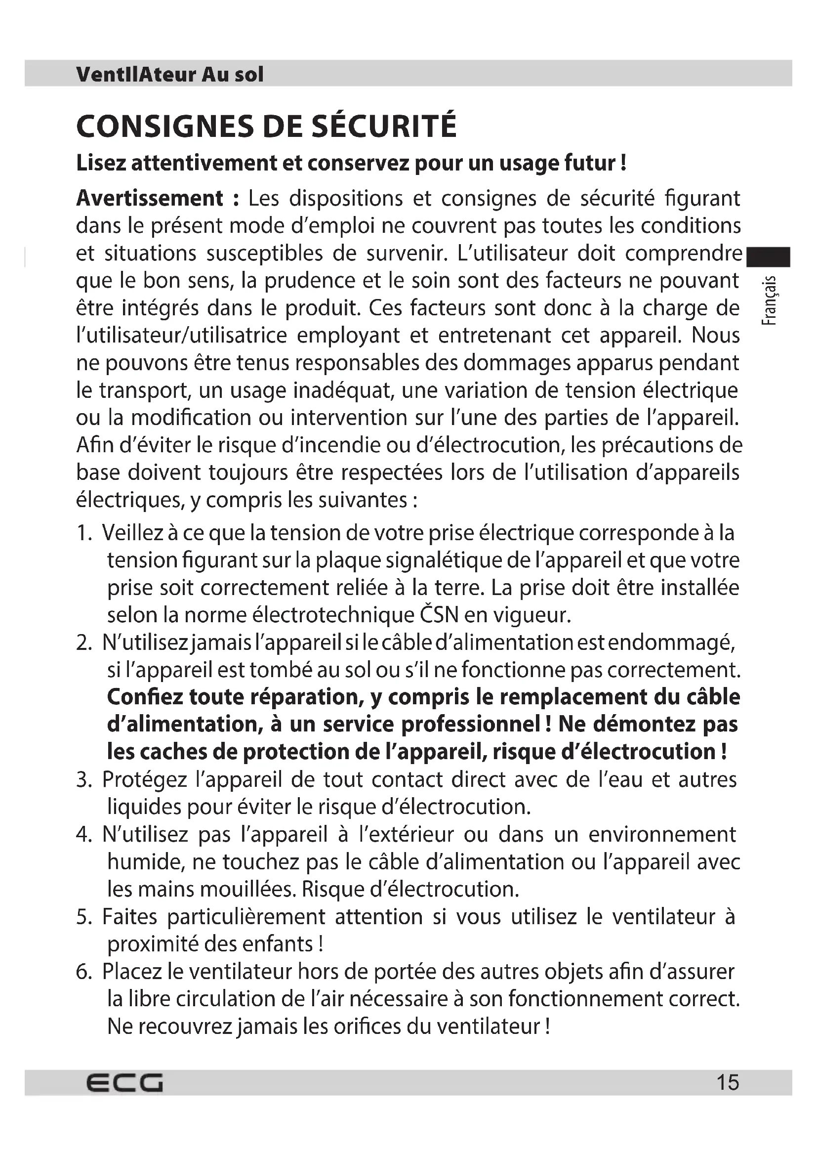 15. Utilisez le ventilateur uniquement conformément aux instructions
