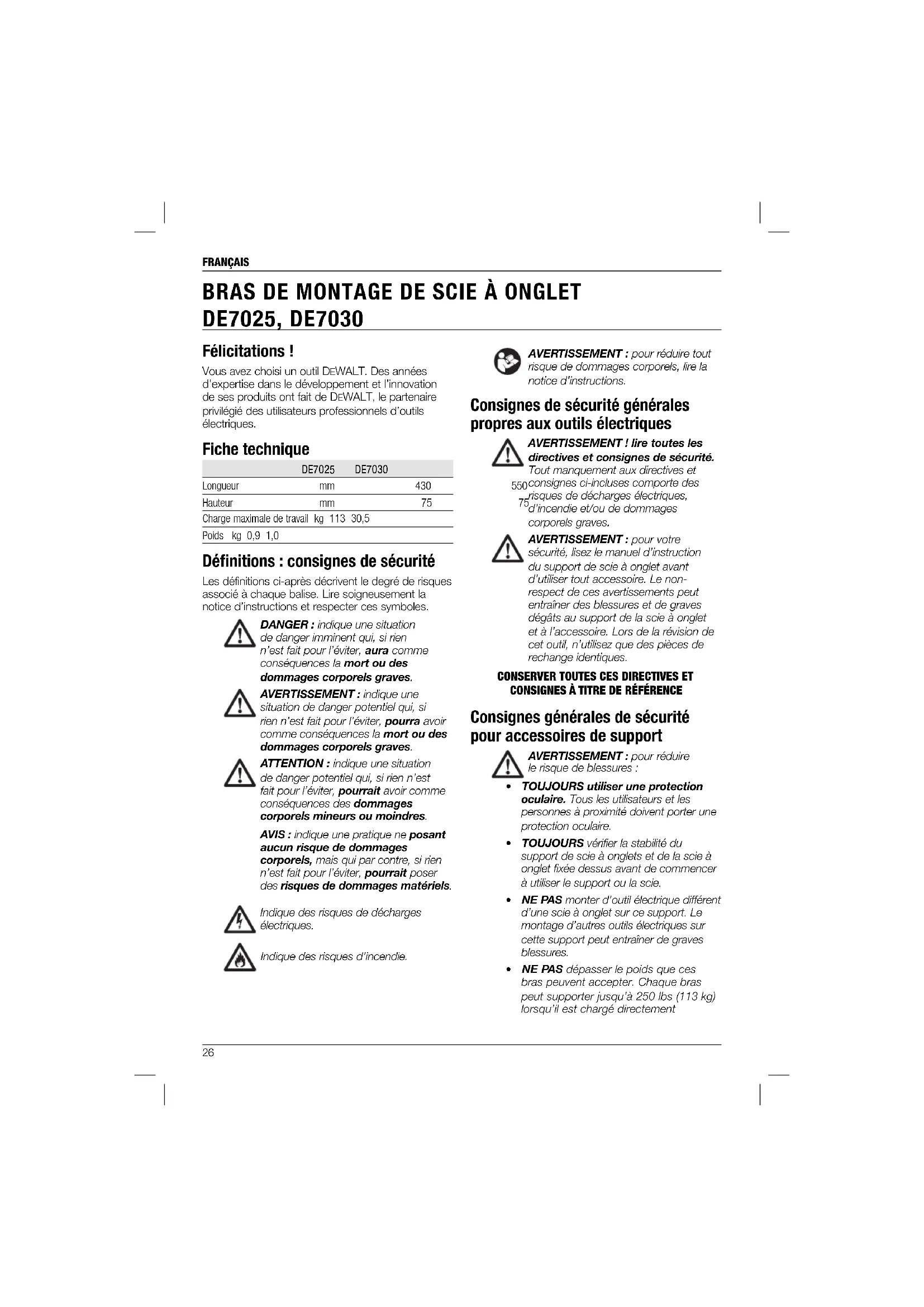 DE7025, DE7030 Félicitations! Vous avez choisi un outil DEWALT. Des années d’expertise dans le développement et l’innovation de ses produits ont fait de DEWALT, le partenaire privilégié des utilisateurs professionnels d’outils électriques. Fiche technique DE7025 DE7030 Longueur mm 430 550 Hauteur mm 75 75 Charge maximale de travail kg 113 30,5 Poids kg 0,9 1,0 Défi nitions: consignes de sécurité Les définitions ci-après décrivent le degré de risques associé à chaque balise. Lire soigneusement la notice d’instructions et respecter ces symboles.
