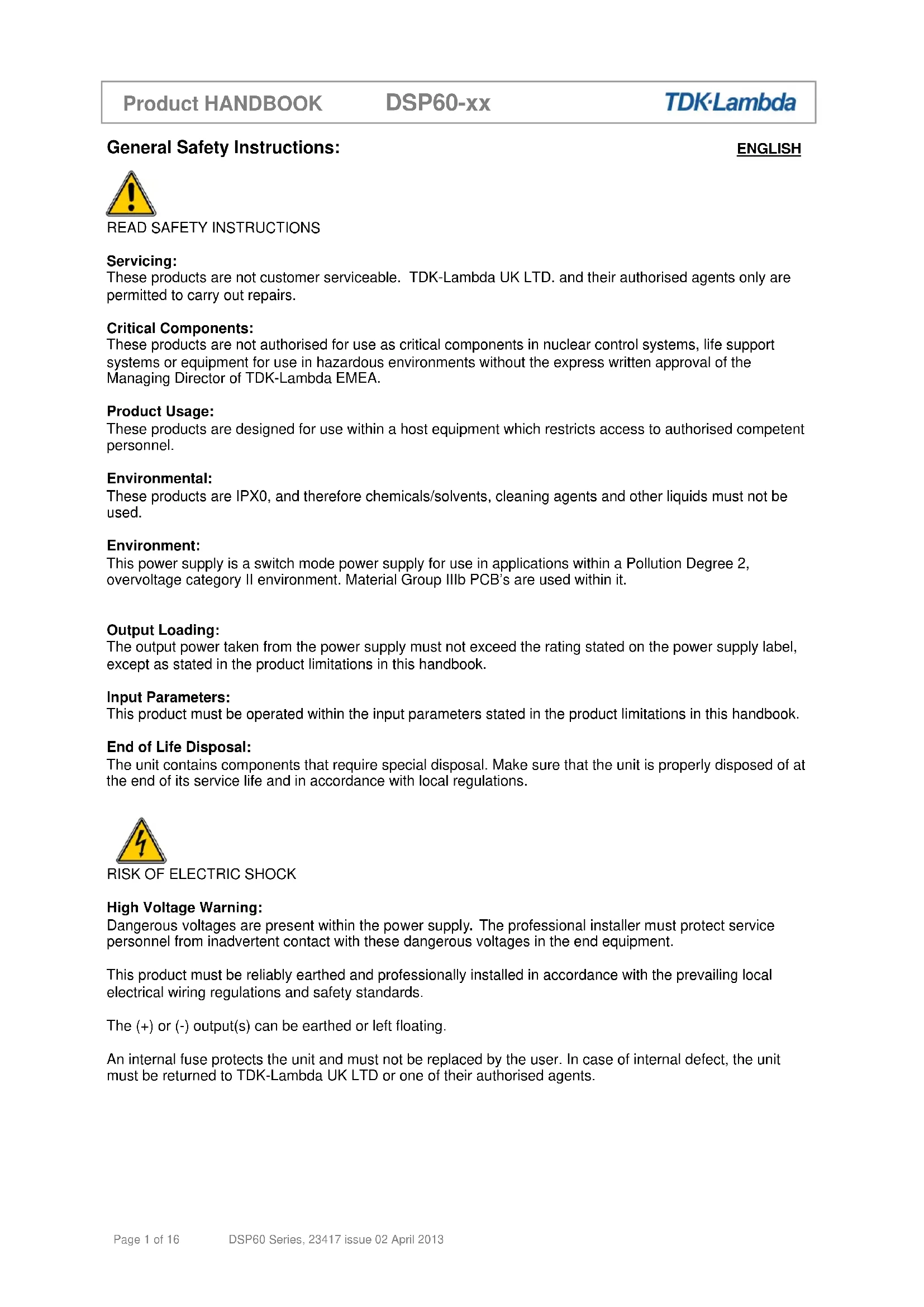 Attention-Danger haute tension: Des tensions dangereuses sont présentes dans l'alimentation. L'installateur doit protéger le personnel d'entretien contre un contact involontaire avec ces tensions dangereuses dans l'équipement final. Ce produit doit être raccordé à une terre fiable et installé par des professionnels en respectant les réglementations locales de câblages électriques en vigueur et les normes de sécurité. Les sorties (+) ou (-) peuvent être raccordées à la terre ou laissées flotttantes. Un fusible interne protège le module et ne doit pas être remplacé par l'utilisateur. En cas de défaut interne, le module doit être renvoyé à TDK-Lambda UK LTD ou l'un de ses agents agréés.Page 6 of 16 DSP60 Series, 23417 issue 02 April 2013