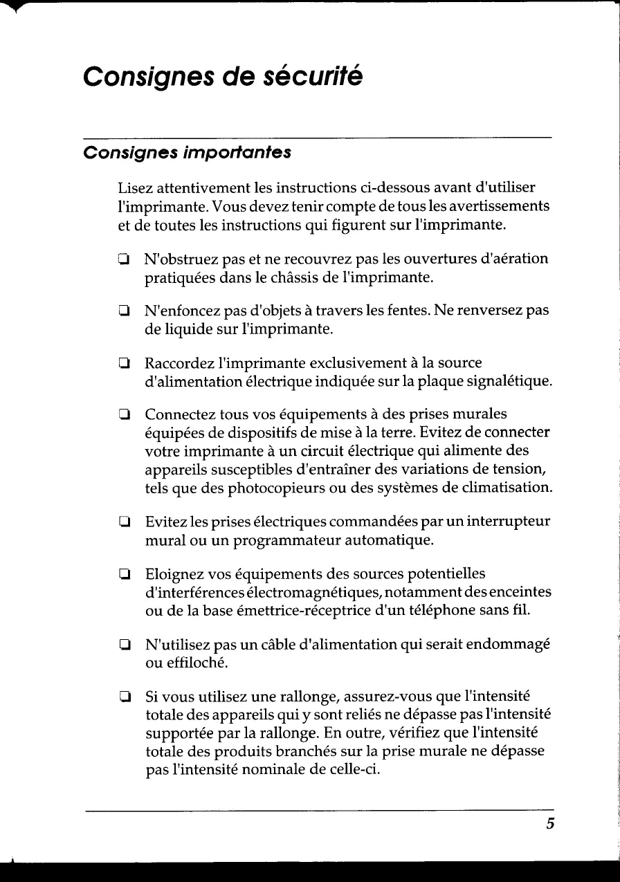 Consignes de sécurité Consignes importantes Lisez attentivement les instructions ci-dessous avant d’utiliser l’imprimante. Vous devez tenir compte de tous les avertissements et de toutes les instructions qui figurent sur l’imprimante. Cl N’obstruez pas et ne recouvrez pas les ouvertures d’aération pratiquées dans le châssis de l’imprimante.