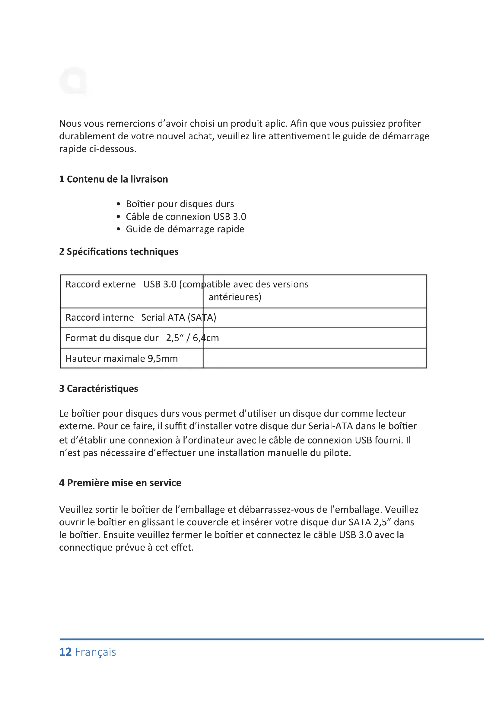 - Guide de démarrage rapide 2 Spécicaons techniques Raccord externe USB 3.0 (compable avec des versions antérieures) Raccord interne Serial ATA (SATA) Format du disque dur 2,5“ / 6,4cm Hauteur maximale 9,5mm 3 Caractérisques Le boîer pour disques durs vous permet d’uliser un disque dur comme lecteur externe. Pour ce faire, il sut d’installer votre disque dur Serial-ATA dans le boîer et d’établir une connexion à l’ordinateur avec le câble de connexion USB fourni. Il n’est pas nécessaire d’eectuer une installaon manuelle du pilote. 4 Première mise en service Veuillez sorr le boîer de l’emballage et débarrassez-vous de l’emballage. Veuillez ouvrir le boîer en glissant le couvercle et insérer votre disque dur SATA 2,5” dans le boîer. Ensuite veuillez fermer le boîer et connectez le câble USB 3.0 avec la connecque prévue à cet eet.13Français 5 Consignes de sécurité et clause de non responsabilité N’essayez jamais d’ouvrir l’appareil pour le réparer ou le modier. Évitez tout contact avec la tension du secteur. Ne court-circuitez pas l’appareil. L’appareil n’est pas étanche, veuillez l’uliser uniquement dans un endroit sec. Protégez-le d’un taux d’humidité élevé, de l’eau et de la neige. N’exposez pas l’appareil à des températures élevées. N’exposez pas l’appareil à des changements de température soudains ou à de fortes vibraons, car cela pourrait endommager les éléments électroniques. Vériez que l’appareil n’est pas endommagé avant de l’uliser Ne pas uliser l’appareil s’il a subi un choc ou qu’il a été endommagé d’une quelconque autre manière. Veillez à respecter les disposions et les restricons naonales. N’ulisez pas l’appareil dans un autre but que celui indiqué dans les instrucons. Cet appareil n’est pas un jouet. Conservez-le hors de portée des enfants ou des personnes aeintes de troubles mentaux. Toute modicaon ou réparaon qui n’a pas été eectuée par le fournisseur d’origine entraîne l’annulaon de la garane et des droits de recours en garane. L’ulisaon de l’appareil est réservée aux personnes qui ont lu et compris les présentes instrucons. Les spécicaons de l’appareil peuvent être modiées sans nocaon préalable. 6 Indicaons de recyclage Les appareils électriques et électroniques ne doivent pas être jetés avec les or- dures ménagères, conformément à la direcve DEEE. Leurs éléments doivent être recyclés ou éliminés séparément, car une éliminaon inappropriée d’éléments toxiques et dangereux pourrait porter préjudice à l’environnement. Conformé- ment à la loi relave aux appareils électroniques, en tant que consommateur, vous êtes obligé de ramener gratuitement les appareils électriques et électro- niques arrivés en n de vie au fabricant, au point de vente ou dans un point de collecte prévu à cet eet. La loi de chaque pays règle les détails connexes. Le symbole sur le produit, le manuel d’ulisaon et/ou l’emballage indique lesdites disposions. Avec ce type de séparaon des maères, de recyclage et d’élimina- on des appareils usagés, vous prenez part acvement à la protecon de notre environnement.14 Français Direcve DEEE: 2012/19/EU EUN° d’enregistrement DEE: 94495668 Par la présente, la société WD Plus GmbH déclare que l’appareil 302509/20170209SZ135 est conforme aux exigences essenelles et aux autres disposions pernentes. Pour obtenir une déclaraon de conformité dans son intégralité, contactez: WD Plus GmbH, Wohlenbergstraße 16, 30179 Hanovre15Español Muchas gracias por haberse decidido por un producto de aplic. Para que pueda disfrutar durante mucho empo del disposivo adquirido, le recomendamos que lea atentamente las siguientes instrucciones. 1 Confezione