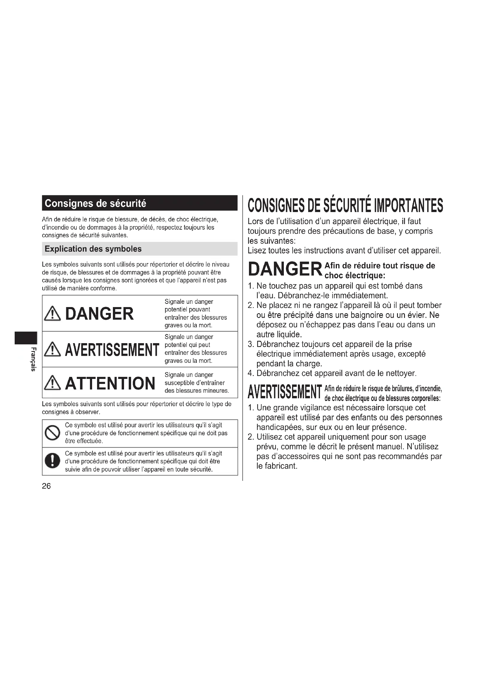 Lorsdel’utilisationd’unappareilélectrique,ilfaut toujoursprendredesprécautionsdebase,ycompris lessuivantes: Liseztouteslesinstructionsavantd’utilisercetappareil. DANGER Anderéduiretoutrisquede chocélectrique: 1.Netouchezpasunappareilquiesttombédans l’eau.Débranchez-leimmédiatement. 2.Neplacezninerangezl’appareillàoùilpeuttomber ouêtreprécipitédansunebaignoireouunévier.Ne déposezoun’échappezpasdansl’eauoudansun autreliquide. 3.Débrancheztoujourscetappareildelaprise électriqueimmédiatementaprèsusage,excepté pendantlacharge. 4.Débranchezcetappareilavantdelenettoyer. AVERTISSEMENT Anderéduirelerisquedebrûlures,d’incendie, dechocélectriqueoudeblessurescorporelles: 1.Unegrandevigilanceestnécessairelorsquecet appareilestutilisépardesenfantsoudespersonnes handicapées,sureuxouenleurprésence. 2.Utilisezcetappareiluniquementpoursonusage prévu,commeledécritleprésentmanuel.N’utilisez pasd’accessoiresquinesontpasrecommandéspar lefabricant.27 Français 3.N’utilisezjamaiscetappareilsilecordonoulache estendommagé,s’ilnefonctionnepascorrectement, s’ilesttombé,endommagéoutombédansl’eau. Retournezl’appareilàuncentrederéparationpour lefaireinspecteretréparer. 4.Gardezlecordonéloignédessurfaceschauffées. 5.Nefaitesjamaistomberoun’insérezpasunobjet danslesouverturesdel’appareil. 6.N’utilisezpasàl’extérieur,dansdesendroitsoùdes aérosols(pulvérisateurs)sontutilisésoulàoùde l’oxygèneestadministré. 7.N’utilisezpascerasoiravecdeslamesderasageet/ ouunegrilleendommagées,carilpourraitprovoquer desblessuresauvisage. 8.Brancheztoujourslacheàl’appareilenpremier, puispourdébrancher,commuteztoutesles commandessur“arrêt”avantdedébrancher. CONSERVEZLESPRÉSENTESINSTRUCTIONS AVERTISSEMENT Cerasoirestdotéd’unepilerechargeableNepaslajeter danslefeu,nilachauffer,lacharger,l’utiliseroula laisserdansunenvironnementàhautetempérature