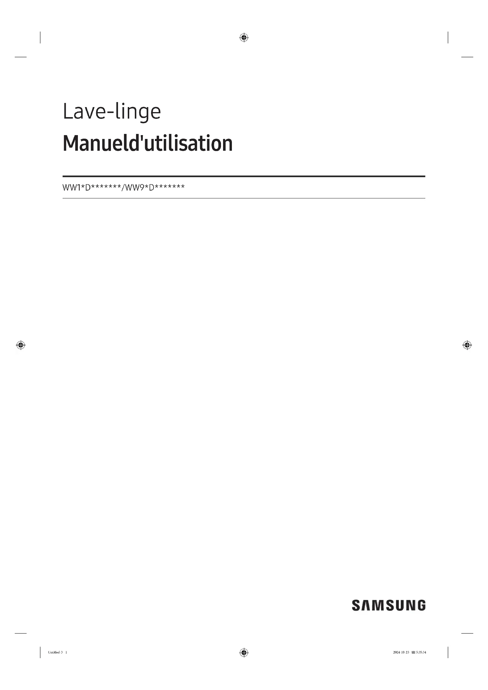 Lave-linge Manuel d'utilisation WW1*D*******/WW9*D******* Untitled-3 1Untitled-3 1 2024-10-23 5:35:342024-10-23 5:35:34Français2 Sommaire Consignes de sécurité 4 Ce que vous devez savoir concernant les consignes de sécurité 4 Symboles de sécurité importants 4 Consignes de sécurité importantes 5 Avertissements importants concernant l'installation 6 Mises en garde concernant l'installation 8 Avertissements importants concernant l'utilisation 8 Mises en garde concernant l'utilisation 9 Avertissements importants concernant le nettoyage 12 Instructions concernant les déchets DEEE 13 Ecodesign 13 Installation 14 Ce qui est fourni 14 Conditions d'installation 16 Installation étape par étape 18 Avant de démarrer 28 Configuration initiale 28 Instructions de lavage 29 Recommandation en matière de lessive 32 Instructions relatives au tiroir à lessive 33 Opérations 37 Panneau de commande 37 Lancement d'un cycle 39 Présentation des cycles 40 Options 43 Réglages 48 Fonctions spéciales 50 SmartThings 51 Déclaration de logiciel open source 52 Untitled-3 2Untitled-3 2 2024-10-23 5:35:342024-10-23 5:35:34Français 3 Maintenance 53 Nettoyage tambour+/Nettoyage tambour 53 Vidange d'urgence 54 Nettoyage 55 Dégel de votre lave-linge 60 Mesures en cas de non-utilisation prolongée 60 Dépannage 61 Contrôles 61 Codes d'information 65 Caractéristiques techniques 68 Tableau des symboles d'entretien des tissus 68 Protection de l'environnement 70 Garantie pour les pièces détachées 70 Fiche de caractéristiques techniques 71 Coordonnées de contact 75