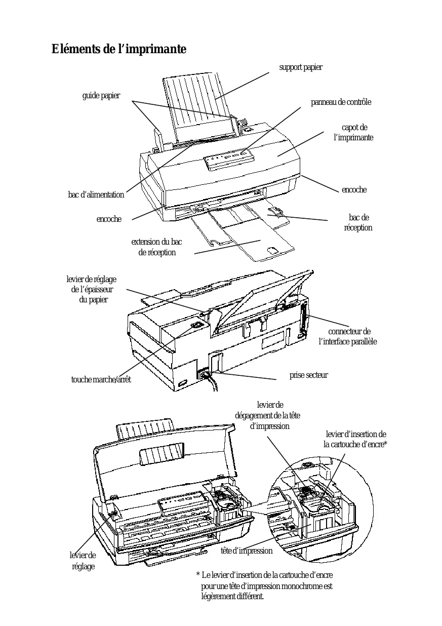 Eléments de l’imprimante support papier guide papier panneau de contrôle capot de l’imprimante encoche bac d’alimentation bac de réception encoche extension du bac de réception levier de réglage de l’épaisseur du papier connecteur de l’interface parallèle prise secteur touche marche/arrêt levier de dégagement de la tête d’impression levier d’insertion de la cartouche d’encre* levier de réglage tête d’impression