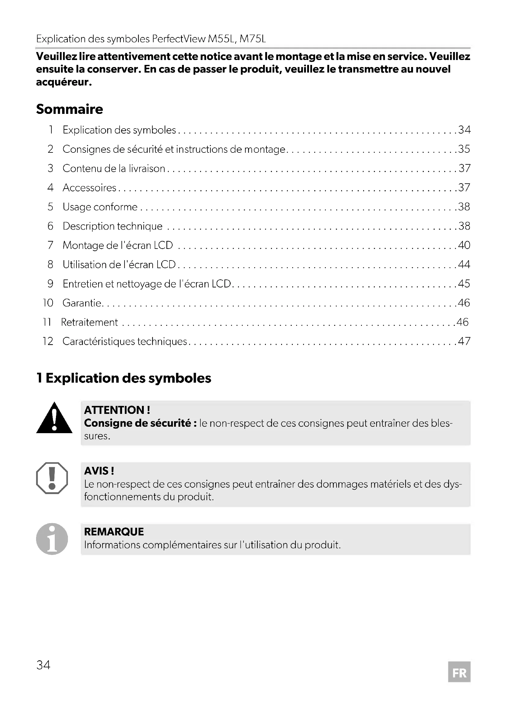 ATTENTION ! Consigne de sécurité : le non-respect de ces consignes peut entraîner des bles- sures. AVIS ! Le non-respect de ces consignes peut entraîner des dommages matériels et des dys- fonctionnements du produit. REMARQUE Informations complémentaires sur l'utilisation du produit. M55L-M75L-IO-16s.book Seite 34 Mittwoch, 20. Dezember 2017 12:32 12PerfectView M55L, M75L Consignes de sécurité et instructions de montage