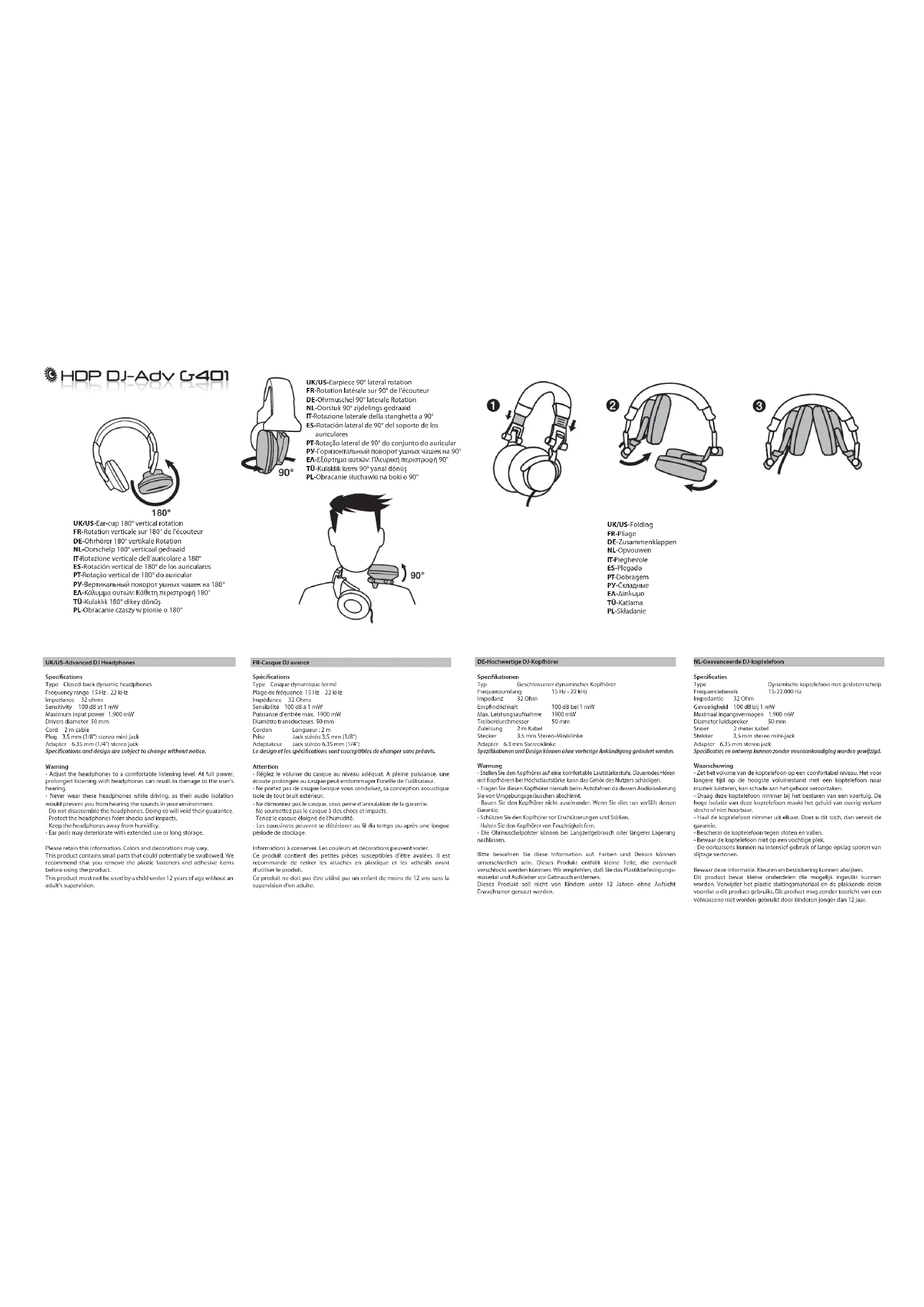 UK/US-Advanced DJ Headphones Specications Type Closed-back dynamic headphones Frequency range 15 Hz - 22 kHz Impedance 32 ohms Sensitivity 100 dB at 1 mW Maximum input power 1,900 mW Drivers diameter 50 mm Cord 2 m cable Plug 3.5 mm (1/8”) stereo mini-jack Adapter 6.35 mm (1/4”) stereo jack Specications and design are subject to change without notice. Warning - Adjust the headphones to a comfortable listening level. At full power, prolonged listening with headphones can result in damage to the user’s hearing. - Never wear these headphones while driving, as their audio isolation would prevent you from hearing the sounds in your environment. - Do not disassemble the headphones. Doing so will void their guarantee. - Protect the headphones from shocks and impacts. - Keep the headphones away from humidity. - Ear pads may deteriorate with extended use or long storage. Please retain this information. Colors and decorations may vary. This product contains small parts that could potentially be swallowed. We recommend that you remove the plastic fasteners and adhesive items before using the product. This product must not be used by a child under 12 years of age without an adult’s supervision. FR-Casque DJ avancé Spécications Type Casque dynamique fermé Plage de fréquence 15 Hz – 22 kHz Impédance 32 Ohms Sensibilité 100 dB à 1 mW Puissance d’entrée max. 1900 mW Diamètre transducteurs 50 mm Cordon Longueur : 2 m Prise Jack stéréo 3,5 mm (1/8”) Adaptateur Jack stéréo 6,35 mm (1/4”) Le design et les spécications sont susceptibles de changer sans préavis. Attention - Réglez le volume du casque au niveau adéquat. A pleine puissance, une écoute prolongée au casque peut endommager l’oreille de l’utilisateur. - Ne portez pas de casque lorsque vous conduisez, sa conception acoustique isole de tout bruit extérieur. - Ne démontez pas le casque, sous peine d’annulation de la garantie. - Ne soumettez pas le casque à des chocs et impacts. - Tenez le casque éloigné de l’humidité. - Les coussinets peuvent se détériorer au l du temps ou après une longue période de stockage. Informations à conserver. Les couleurs et décorations peuvent varier. Ce produit contient des petites pièces susceptibles d’être avalées. Il est recommandé de retirer les attaches en plastique et les adhésifs avant d’utiliser le produit. Ce produit ne doit pas être utilisé par un enfant de moins de 12 ans sans la supervision d’un adulte. UK/US-Folding FR-Pliage DE-Zusammenklappen NL-Opvouwen IT-Pieghevole ES-Plegado PT-Dobragem РУ-Складные
