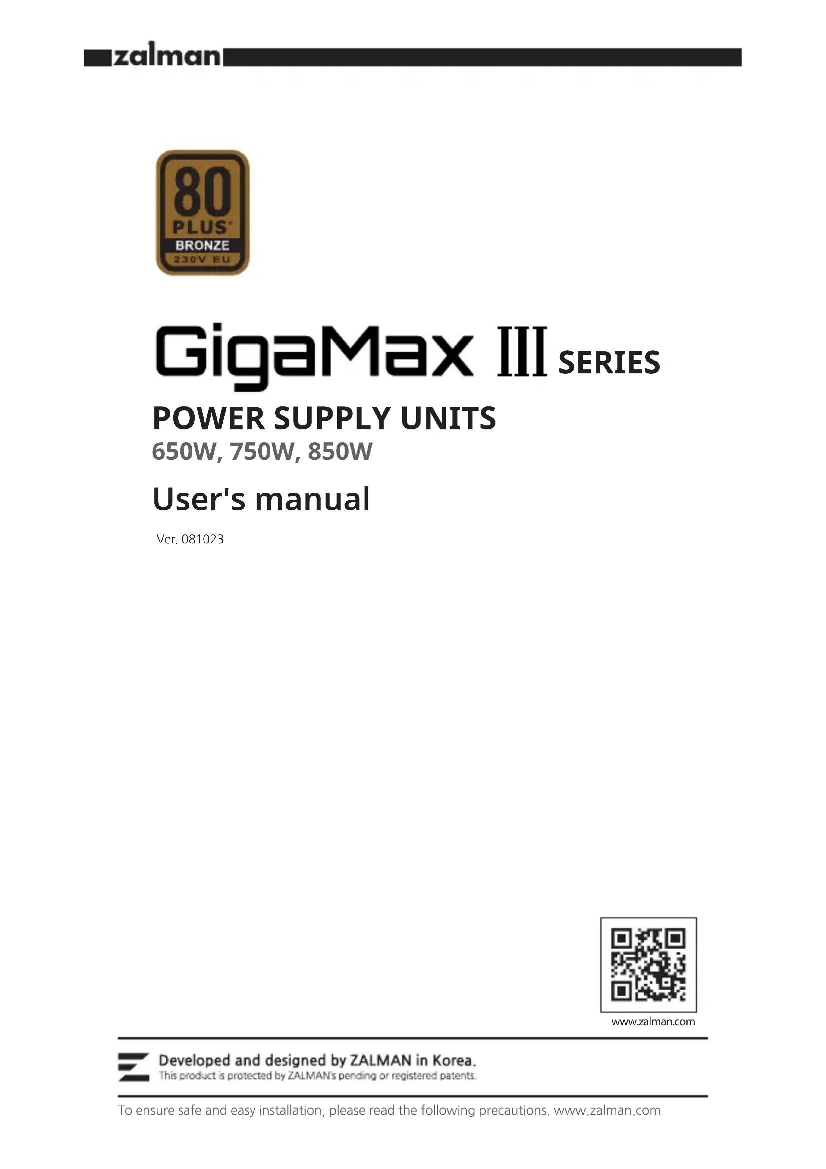 SERIES 650W, 750W, 850W www.zalman.com1 WARNING This product is designed for computer use only, such as offices, multimedia, the Internet and games. Using this product in any other application will void the warranty. The power supply unit(PSU) is for integration into a computer system and not intended for external or outdoor usage. Please note that Full Modular PSU's warranty is applicable to the power supply unit ONLY and does not include accessories such as, power cable, connector and etc. Non-Modular warranty is applicable to PSU and its power cables. If you have any questions, please ask a specialist for help. DISCLAIMER Zalman Tech Co., Ltd. is not responsible for any damages due to external causes, including but not limited to, improper use, problems with electrical power, accident, neglect, alteration, repair, improper installation, or improper testing. ▶ Opening the cover of the product while the power cord is plugged into an outlet may cause electrocution or critical damage to the product. ▶ Handling the power cord with wet hands may cause electrocution. ▶ Inserting fingers or metallic objects into the cooling fan may cause injury or electrocution. ▶ Operating the product in an extremely cold or hot environment can degrade product performance and lifespan. ▶ Exposure to liquids may cause malfunction. ▶ Operation in a humid or non-ventilated environment may reduce product lifespan. ▶ Plugging the main power connector P1 into the motherboard while the product is connected to the AC power source may cause damage to the motherboard. ▶ Make sure that the connectors are connected to their designated locations, and that the connectors are not oriented in the wrong direction when connecting the DC output connectors. ▶ Please use gloves to prevent injuries during installation. ▶ Product designs and specifications may be revised without prior notification to improve quality and performance. Neglecting the following may cause minor injuries, degrade product conditions or cause malfunction. Warnings and Safety Precautions English Neglecting the following may cause serious injury or death. WARNING CAUTION2 AVERTISSEMENT Ce produit est conçu pour un usage informatique uniquement, tel que des bureaux, du multimédia, Internet et des jeux. L’utilisation de ce produit dans toute autre application annulera la garantie. L’unité d’alimentation est destinée à être intégrée dans un système informatique et n’est pas prévue pour un usage externe ou en extérieur. Veuillez noter que la garantie de l’unité d’alimentation entièrement modulaire s’applique UNIQUEMENT à l’unité d’alimentation et ne comprend pas d’accessoires tels que le câble d’alimentation, le connecteur, etc. La garantie non modulaire s’applique à l’unité d’alimentation ainsi qu’à ses câbles d’alimentation. Si vous avez des questions, veuillez consulter un spécialiste. RESPONSABILITÉ Zalman Tech Co Ltd., ne saura être tenu pour responsable en cas de dommages dus à des causes externes, incluant mais non limitées à une mauvaise utilisation, à des problémes électriques, à un accident, à une négligence, à une altération, à une réparation, à une mauvaise installation ou à des tests inadaptés. Français Avertissements et précautions de sécurité ▶ Ouvrir le produit alors que le cordon d' alimentation est branch é à une prise peut causer une électrocution ainsi que de sérieux dommages au produit ▶ Manipuler le cordon d'alimentation avec les mains humides peut causer une électrocution ▶ Insérer les doigts ou des dbjets métalliques dans le ventilateur alors que celui-ci est en fonctionnement peut entraîner de graves accidents, voire une électrocution. ▶ Faire fonctionner le produit dans un denvironnement trop chaud ou trop froid peut avoir des cons équences néfastes sur les performances du produit et sur sa durée de vie. ▶ L'exposition à des liquides peut entra îner un dysfonctionnemnet. ▶ Faire fonctionner le produit dans un endroit humide ou mal a éré peut aecter sa durée de vie ▶ Brancher le connecteur d'alimentation principal P1 à la carte mére alors que le produit est relié à la source d'alimentation AC peut endommager la carte mére. ▶ Assurez-vous que les connecteurs soient correctement branch és, et qu'ils ne soient pas orientés vers la manvaise direction lorsque vous branchez les connecteurs de sortie DC. ▶ Veuillez porter des gants an d' éviter tout probléme durant l'istallation. ▶ Le design et les sp écifications de ce produit pourront être modifiés sans notification préalable an d'en améliorer la qualité et les performnaces.