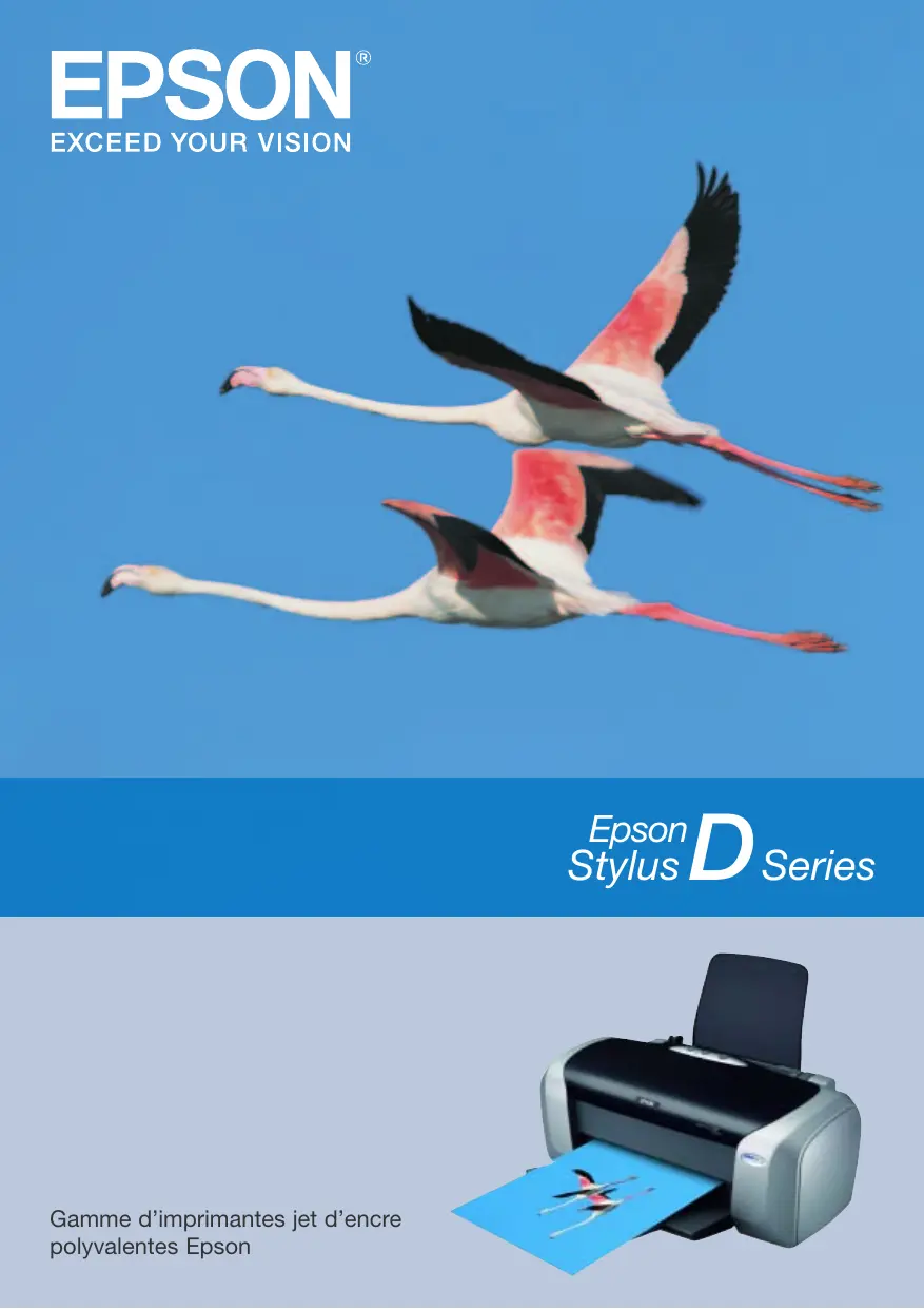 D Series – 1FR – 08/05 Remarque sur les vitesses d’impression : les vitesses d'impression peuvent varier en fonction des conditions d'impression. Epson France S.A. Siège social, agence Paris et consommables BP 320 – 92305 Levallois-Perret CEDEX Agences régionales : Bordeaux, Lille, Lyon, Marseille, Nantes, Strasbourg, Toulouse. Information : 0892 899 999 (0,34€/min) Collecte des consommables usagés CONIBI: 01 48 63 94 94 www.conibi.fr Supp.Tech.(gar. std) : 0892 899 999 (0,34€/min) www.epson.fr EPSON® est une marque déposée de SEIKO EPSON® Corporation. Tous les autres noms de produits et de sociétés utilisés dans ce document le sont à des fins d'identification uniquement et peuvent être des marques commerciales ou des marques déposées de leurs détenteurs respectifs. Sous réserve d'erreurs et d'omissions, toutes les caractéristiques sont sujettes à modification sans préavis.