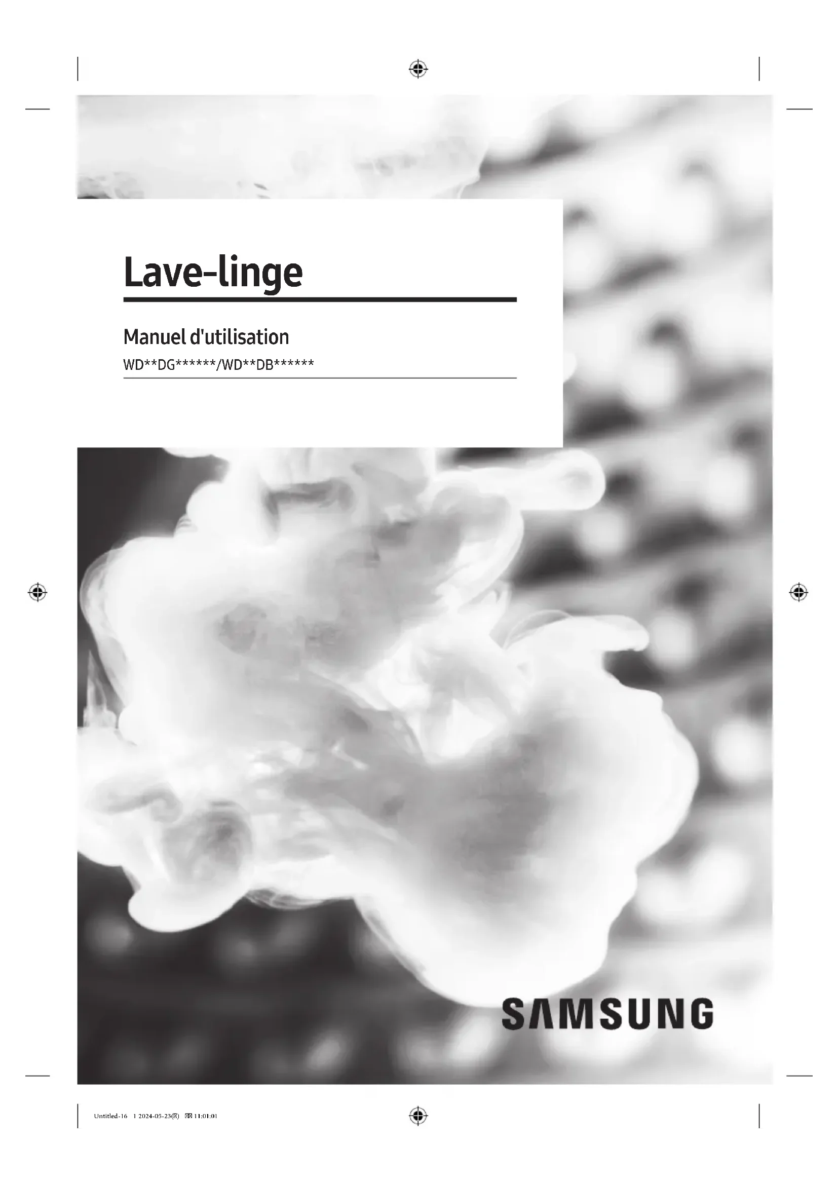 Lave-linge Manuel d'utilisation WD**DG******/WD**DB****** Untitled-16 1 2024-05-23() 11:01:01Français2 Sommaire Consignes de sécurité 4 Ce que vous devez savoir concernant les consignes de sécurité 4 Symboles de sécurité importants 4 Consignes de sécurité importantes 5 Avertissements importants concernant l'installation 8 Mises en garde concernant l'installation 10 Avertissements importants concernant l'utilisation 10 Mises en garde concernant l'utilisation 12 Avertissements importants concernant le nettoyage 15 Instructions concernant les déchets DEEE 15 Installation 16 Ce qui est fourni 16 Conditions d'installation 18 Installation étape par étape 20 Avant de démarrer 30 Conguration initiale 30 Instructions de lavage 31 Recommandation en matière de lessive 34 Instructions relatives au tiroir à lessive 35 Opérations 40 Panneau de commande 40 Lancement d'un cycle 43 Présentation des cycles 44 Options/Fonctions supplémentaires 48 Réglages/Fonctions système 52 Fonctions spéciales 56 SmartThings 57 Déclaration de logiciel open source 58 Maintenance 59 Nettoyage tambour+ 59 Vidange d'urgence 60 Nettoyage 61 Dégel de votre lave-linge 66 Mesures en cas de non-utilisation prolongée 66 Untitled-16 2 2024-05-23() 11:01:01Français 3 Dépannage 67 Contrôles 67 Codes d'information 71 Caractéristiques techniques 74 Tableau des symboles d'entretien des tissus 74 Protection de l'environnement 76 Garantie pour les pièces détachées 76 Fiche de caractéristiques techniques 76 Coordonnées de contact 80