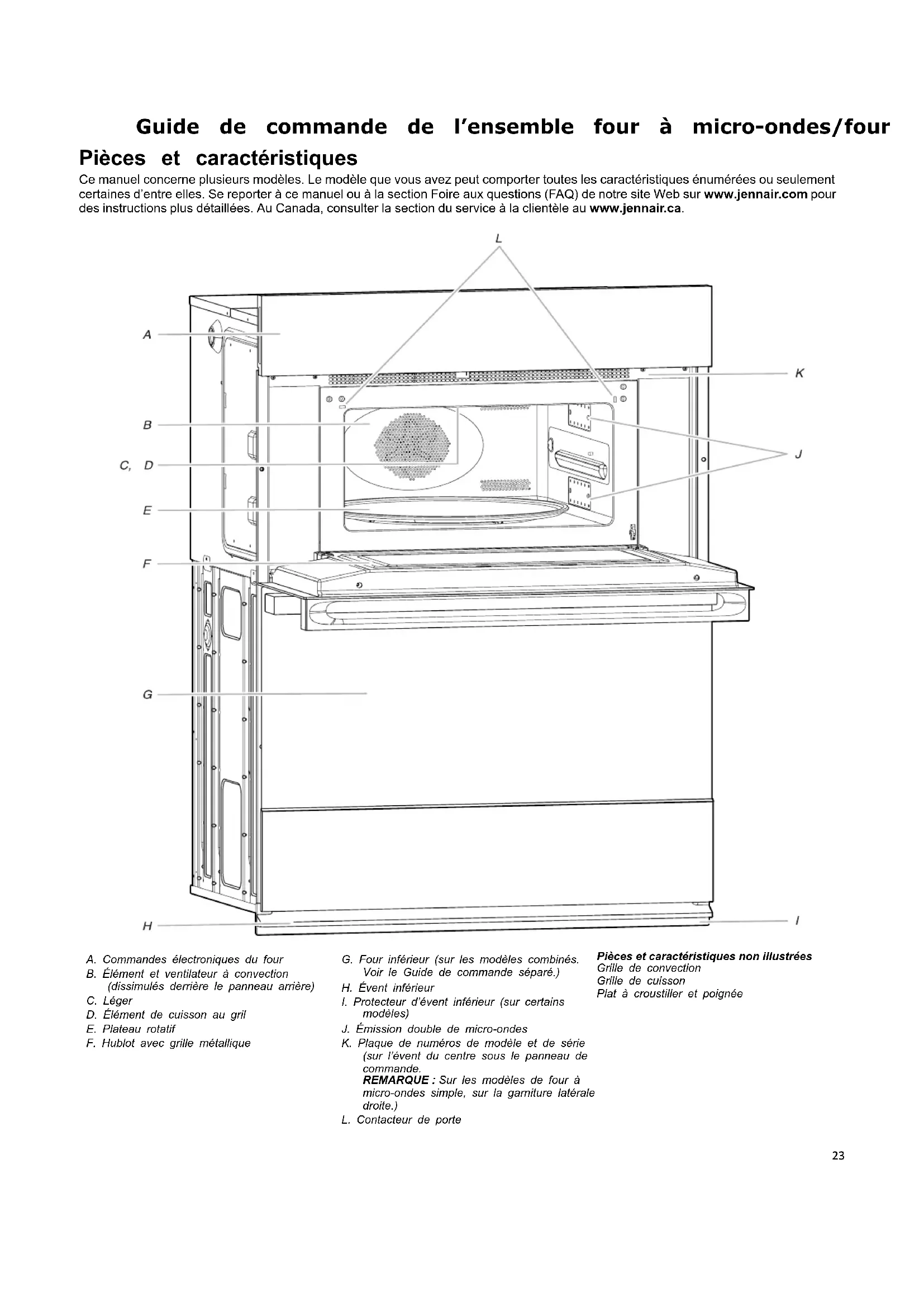 Guide de commande de l’ensemble four à micro-ondes/four Pièces et caractéristiques Ce manuel concerne plusieurs modèles. Le modèle que vous avez peut comporter toutes les caractéristiques énumérées ou seulement certaines d’entre elles. Se reporter à ce manuel ou à la section Foire aux questions (FAQ) de notre site Web sur www.jennair.com pour des instructions plus détaillées. Au Canada, consulter la section du service à la clientèle au www.jennair.ca. A. Commandes électroniques du four B. Élément et ventilateur à convection (dissimulés derrière le panneau arrière) C. Léger D. Élément de cuisson au gril E. Plateau rotatif F. Hublot avec grille métallique G. Four inférieur (sur les modèles combinés. Voir le Guide de commande séparé.) H. Évent inférieur