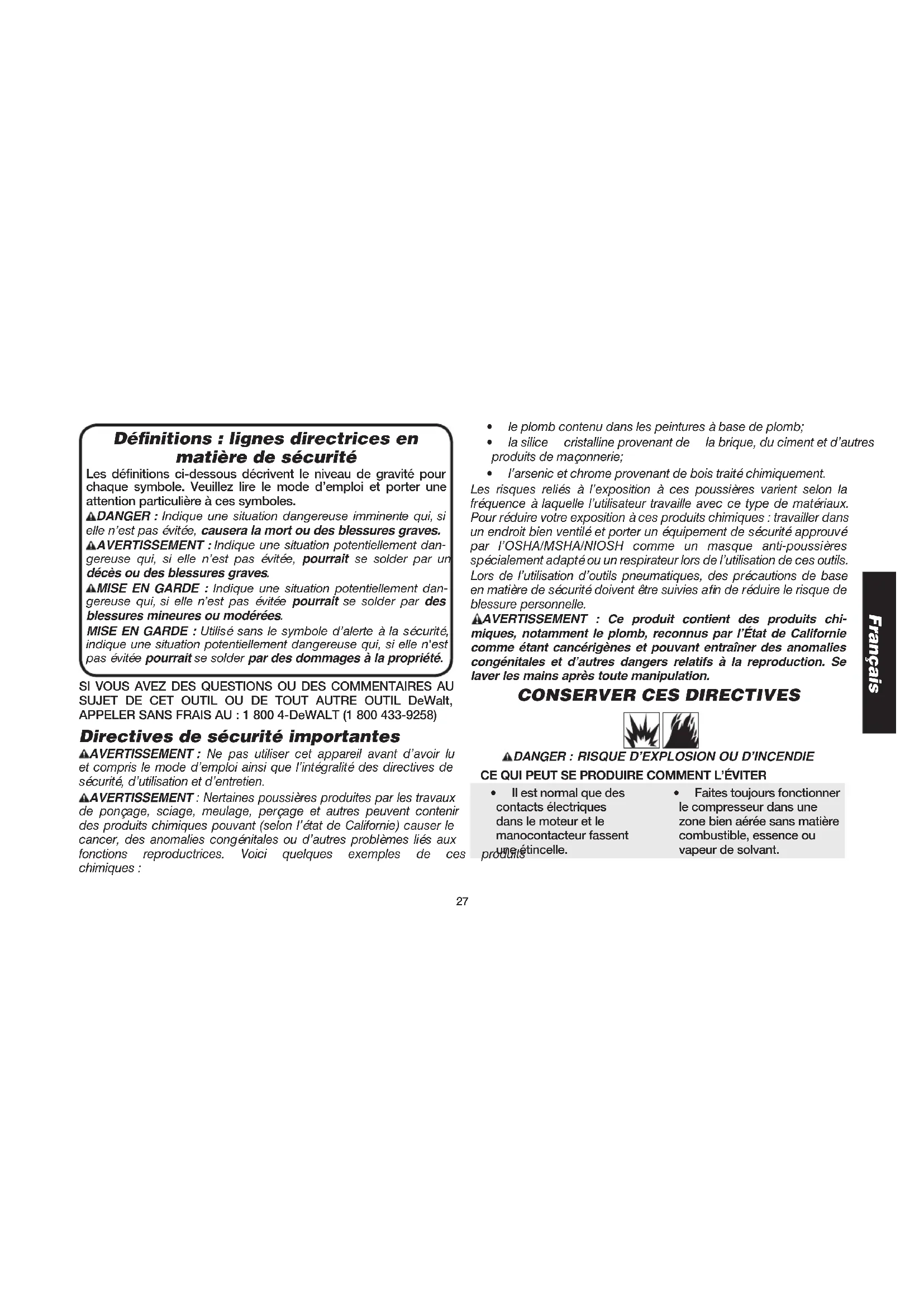 WALT. Ne pas faire fonctionner le compresseur dans une zone de pulvérisation de peinture. Lire l'avertissement concernant les vapeurs inflammables.Français