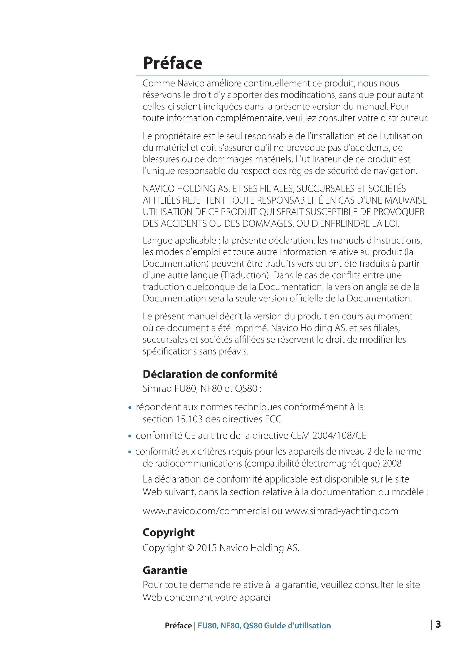 Comme Navico améliore continuellement ce produit, nous nous réservons le droit d'y apporter des modifications, sans que pour autant celles-ci soient indiquées dans la présente version du manuel. Pour toute information complémentaire, veuillez consulter votre distributeur.