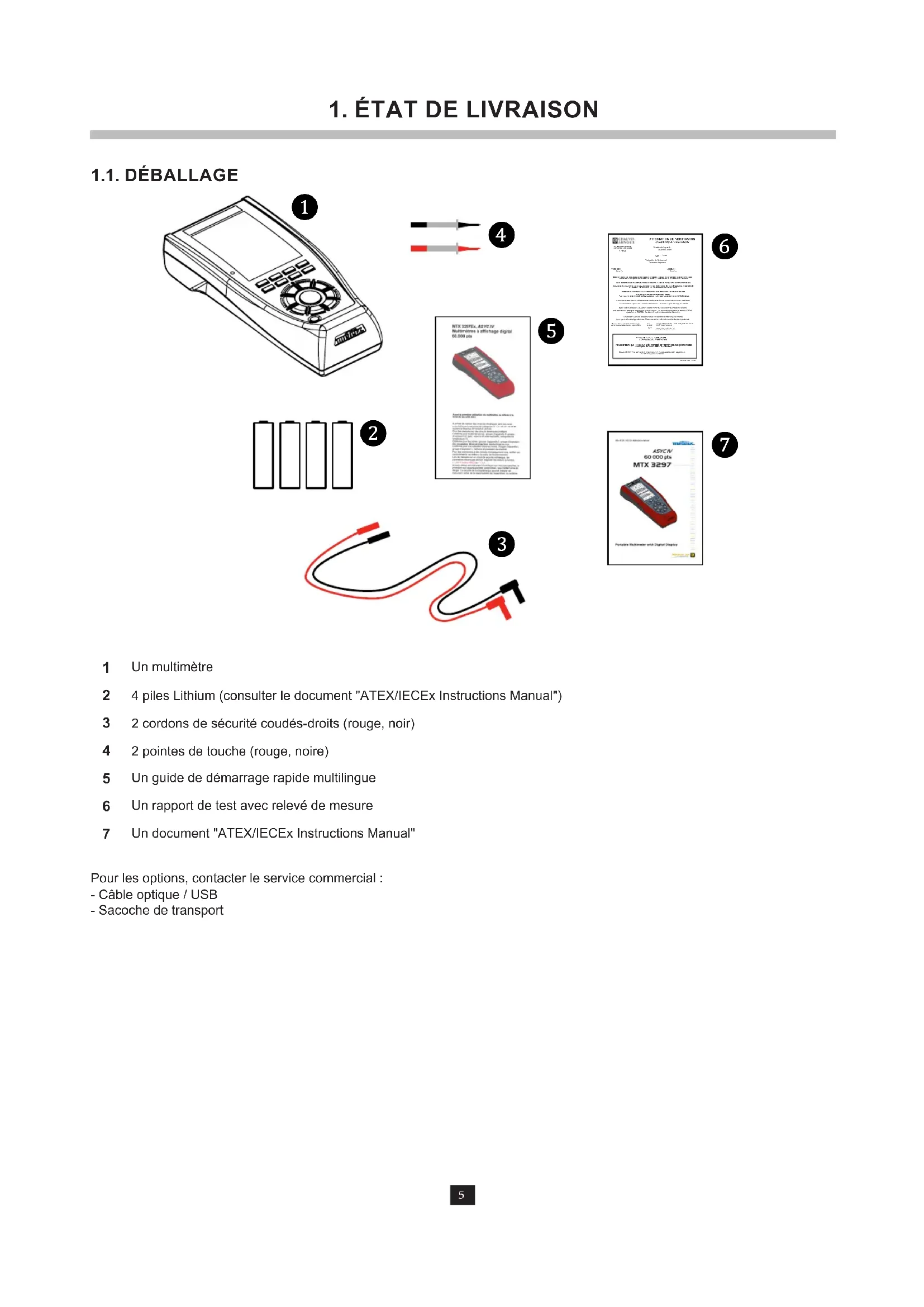 2.1. INTRODUCTION MTX 3297Ex ATEX Achage Digital monochrome rétro-éclairé (70 x 52) Alimentation 4 piles qualiées 1,5 V Points 60 000 Communication IR / USB Ce multimètre est conformes à la norme de sécurité IEC 61010-2-033, relative aux multimètres. 2.2. PRÉCAUTIONS ET MESURES DE SÉCURITÉ Cette notice ne concerne que l'usage du MTX 3297Ex en zone sûre non explosive. Cet instrument a été conçu pour une utilisation : en intérieur dans un environnement de degré de pollution 2 à une altitude inférieure à 2 000 m à une température comprise entre -10°C et 55°C avec une humidité relative inférieure à 80 % jusqu'à 31°C. La sécurité de tout système intégrant l'instrument relève de la responsabilité de l'assembleur du système. Ils sont utilisables pour des mesures sur des circuits : MTX 3297Ex zone sûre : 1000 V CAT III et 600 V CAT IV MTX 3297Ex zone explosive : se référer aux documents : ATEX/IECEx Instructions Manual Certains accessoires peuvent conduire à utiliser cet instrument sur des circuits de tension et de catégorie inférieures.
