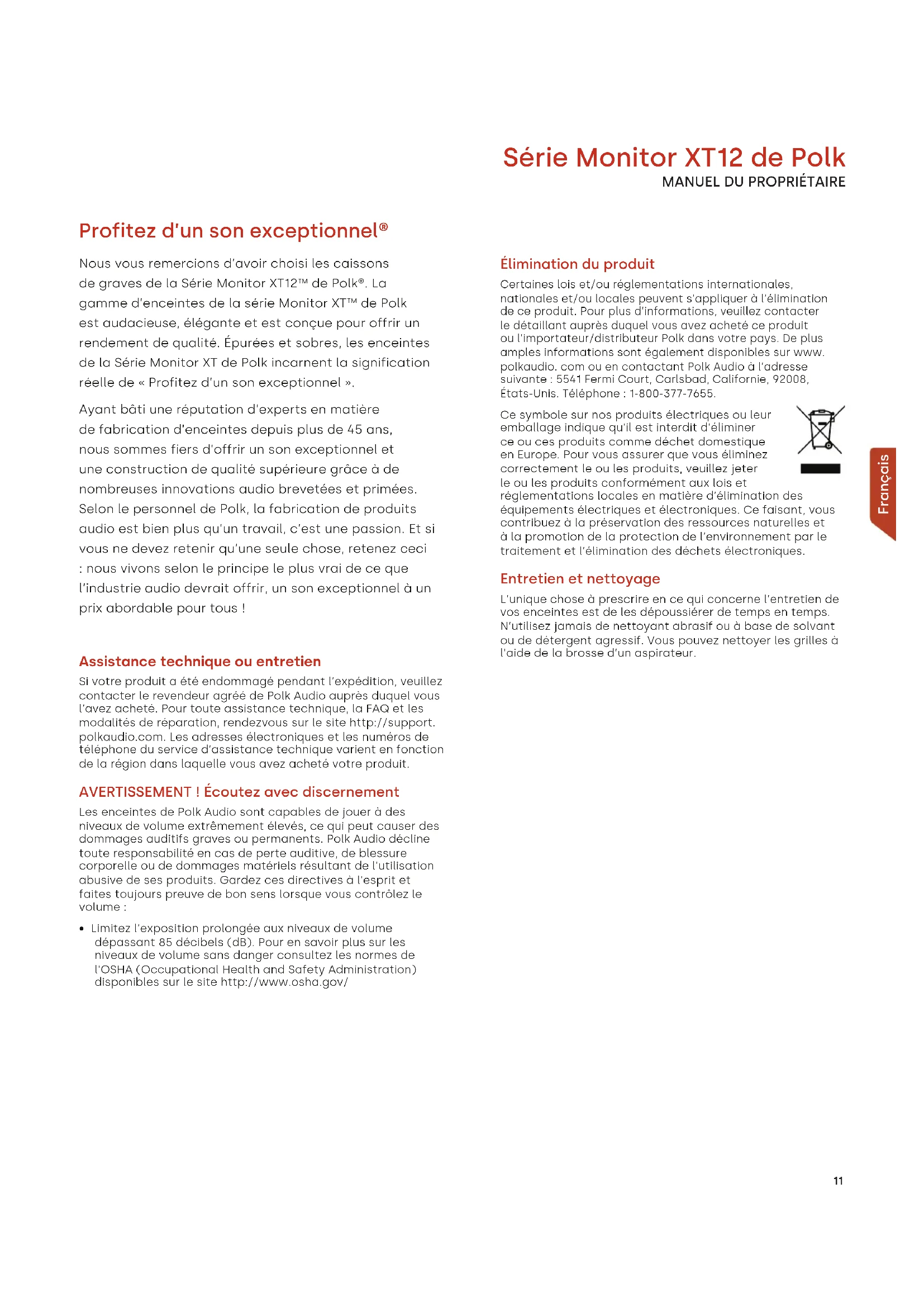 - Limitez l’exposition prolongée aux niveaux de volume dépassant 85 décibels (dB). Pour en savoir plus sur les niveaux de volume sans danger consultez les normes de l’OSHA (Occupational Health and Safety Administration) disponibles sur le site http://www.osha.gov/ Élimination du produit Certaines lois et/ou réglementations internationales, nationales et/ou locales peuvent s’appliquer à l’élimination de ce produit. Pour plus d’informations, veuillez contacter le détaillant auprès duquel vous avez acheté ce produit ou l’importateur/distributeur Polk dans votre pays. De plus amples informations sont également disponibles sur www. polkaudio. com ou en contactant Polk Audio à l’adresse suivante : 5541 Fermi Court, Carlsbad, Californie, 92008, États-Unis. Téléphone : 1-800-377-7655. Ce symbole sur nos produits électriques ou leur emballage indique qu’il est interdit d’éliminer ce ou ces produits comme déchet domestique en Europe. Pour vous assurer que vous éliminez correctement le ou les produits, veuillez jeter le ou les produits conformément aux lois et réglementations locales en matière d’élimination des équipements électriques et électroniques. Ce faisant, vous contribuez à la préservation des ressources naturelles et à la promotion de la protection de l’environnement par le traitement et l’élimination des déchets électroniques. Entretien et nettoyage L’unique chose à prescrire en ce qui concerne l’entretien de vos enceintes est de les dépoussiérer de temps en temps. N’utilisez jamais de nettoyant abrasif ou à base de solvant ou de détergent agressif. Vous pouvez nettoyer les grilles à l’aide de la brosse d’un aspirateur. Français Série Monitor XT12 de Polk