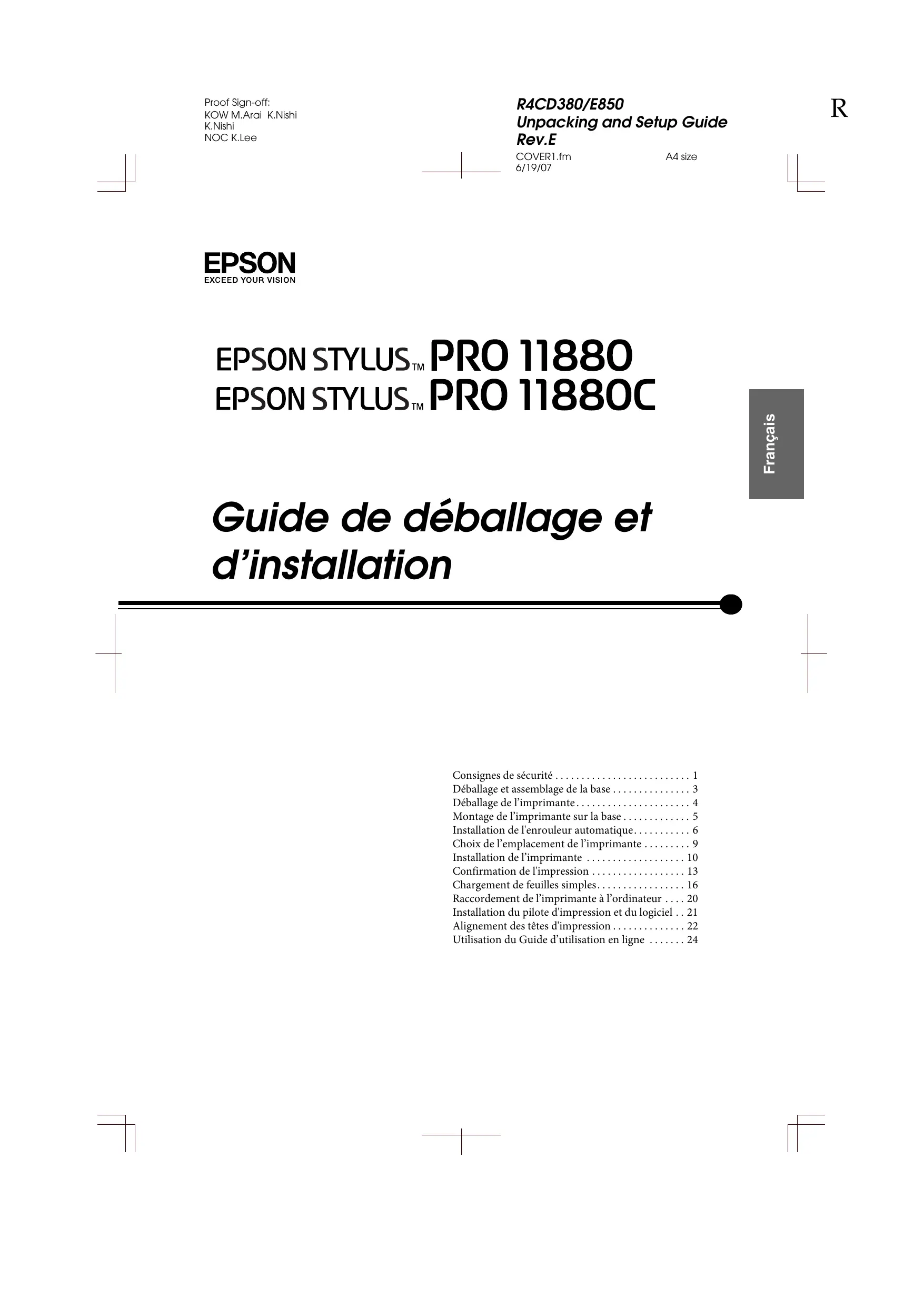 R4CD380/E850 Unpacking and Setup Guide Rev.E COVER2.fm 6/19/07 Proof Sign-off: KOW M.Arai K.Nishi K.Nishi NOC K.Lee A4 size Éléments de l’imprimante Vue de face Capot du papier rouleau Axe du papier rouleau Levier de maintien du papier Axe du rouleau de papier Capot avant Panneau de contrôle Guides papier Touche d'ouverture du couvercle du logement des cartouches Enrouleur automatique Compartiment des cartouches d’encre Vue de l’arrière Connecteur d’interface réseau Prise secteur Connecteur d’interface USB Réservoirs de maintenance Connecteur de l'enrouleur automatique La reproduction, l’enregistrement ou la diffusion de tout ou partie de ce manuel, sous quelque forme et par quelque moyen que ce soit, électronique, mécanique, photocopie, sonore ou autre, sont interdits sans l’autorisation écrite préalable de Seiko Epson Corporation. Les informations contenues dans le présent manuel ne s’appliquent qu’à l’imprimante Epson décrite ci-après. Epson n’est pas responsable de l’éventuelle utilisation de ces renseignements avec d’autres imprimantes. Ni Seiko Epson Corporation ni ses filiales ne pourront être tenues responsables envers l’acquéreur de ce produit ou envers les tiers, des dommages, pertes, frais ou dépenses encourus par l’acquéreur ou les tiers à la suite des événements suivants : accident, mauvaise utilisation ou utilisation abusive de ce produit, modifications, réparations ou altérations illicites de ce produit ou (sauf aux États-Unis) non-respect au sens strict des consignes d’utilisation et de maintenance de Seiko Epson Corporation. Seiko Epson Corporation ne pourra être tenue responsable des dommages ou problèmes survenus par suite de l’utilisation de produits optionnels ou consommables autres que ceux désignés par Seiko Epson Corporation comme étant des Produits d’origine Epson ou des Produits approuvés par Epson. Seiko Epson Corporation ne pourra être tenue responsable des dommages résultant des interférences électromagnétiques se produisant à la suite de l’utilisation de câbles d’interface autres que ceux désignés par Seiko Epson Corporation comme étant des Produits approuvés par Epson.