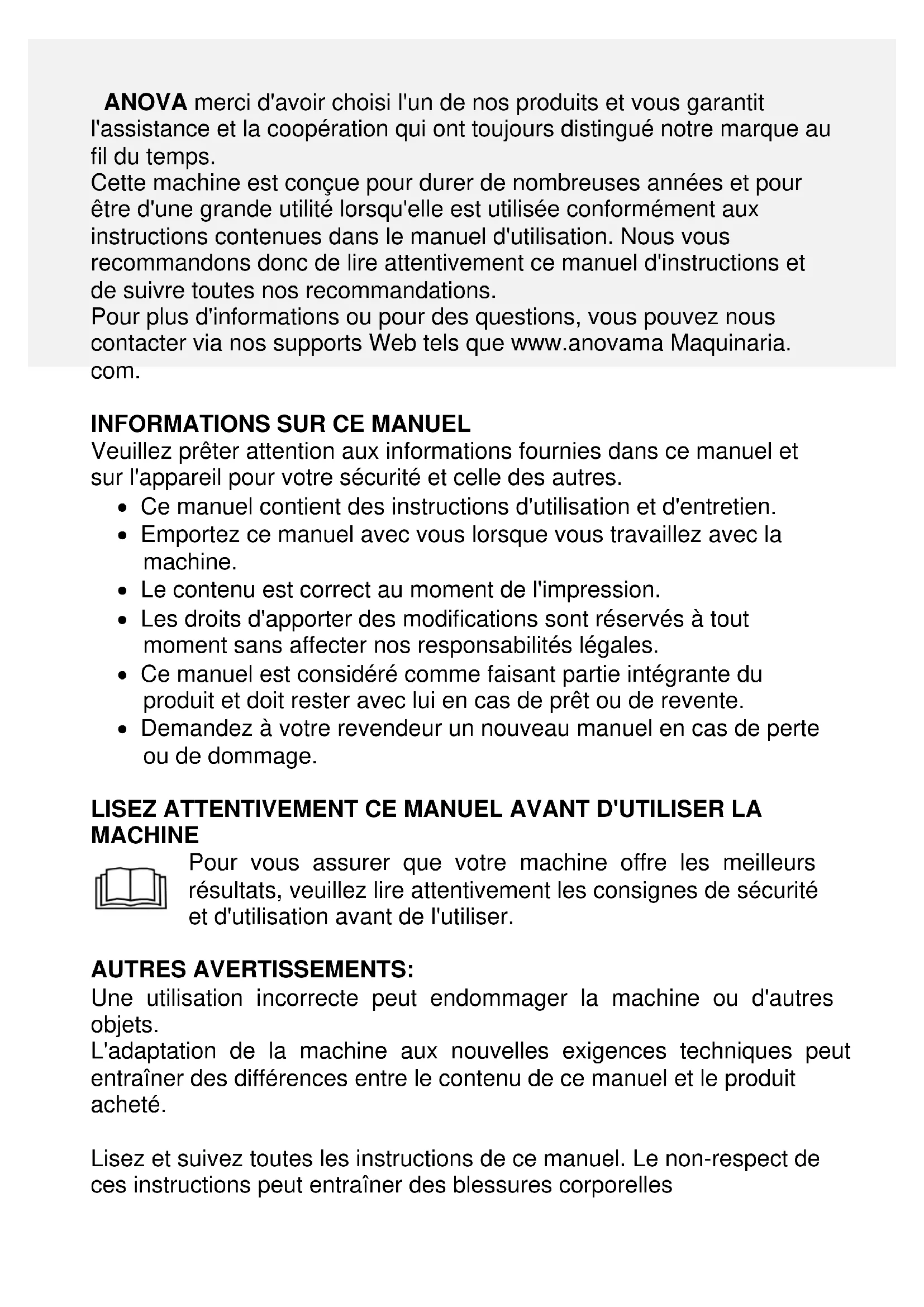 Millasur, SL. Rúa Eduardo Pondal, nº 23 - Pol. Ind. Sigüeiro 15688 - Oroso - La Corogne 981 696465 www.millasur.com FRANOVA merci d'avoir choisi l'un de nos produits et vous garantit l'assistance et la coopération qui ont toujours distingué notre marque au fil du temps. Cette machine est conçue pour durer de nombreuses années et pour être d'une grande utilité lorsqu'elle est utilisée conformément aux instructions contenues dans le manuel d'utilisation. Nous vous recommandons donc de lire attentivement ce manuel d'instructions et de suivre toutes nos recommandations. Pour plus d'informations ou pour des questions, vous pouvez nous contacter via nos supports Web tels que www.anovama Maquinaria. com.
