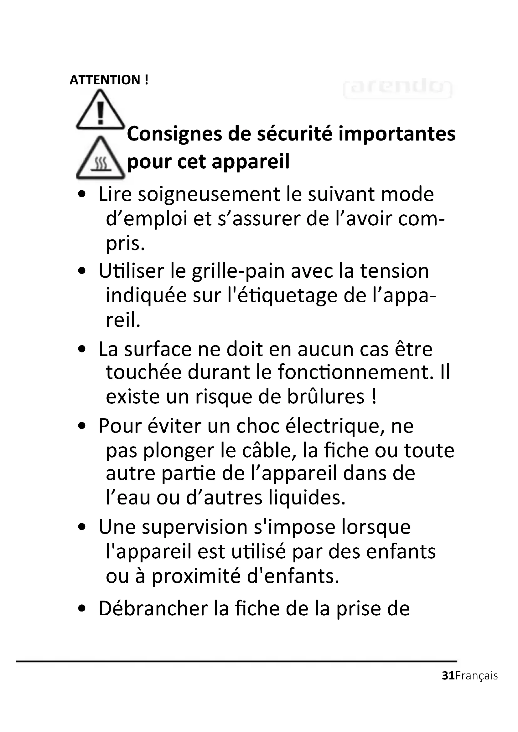 - N’uliser que des pains de mie de taille standard. Lorsque le pain de mie est trop pet, vous courrez le risque de vous brûler les doigts lors de l’extracon du pain !37Français Nous vous remercions d'avoir acheté un produit d'Arendo. Pour que vous puissiez proter longtemps de votre appareil acquis, veuillez lire aenvement le mode d'emploi suivant. Avant la mise en service du produit livré, vériez s'il est com- plet, sans défauts et intact.