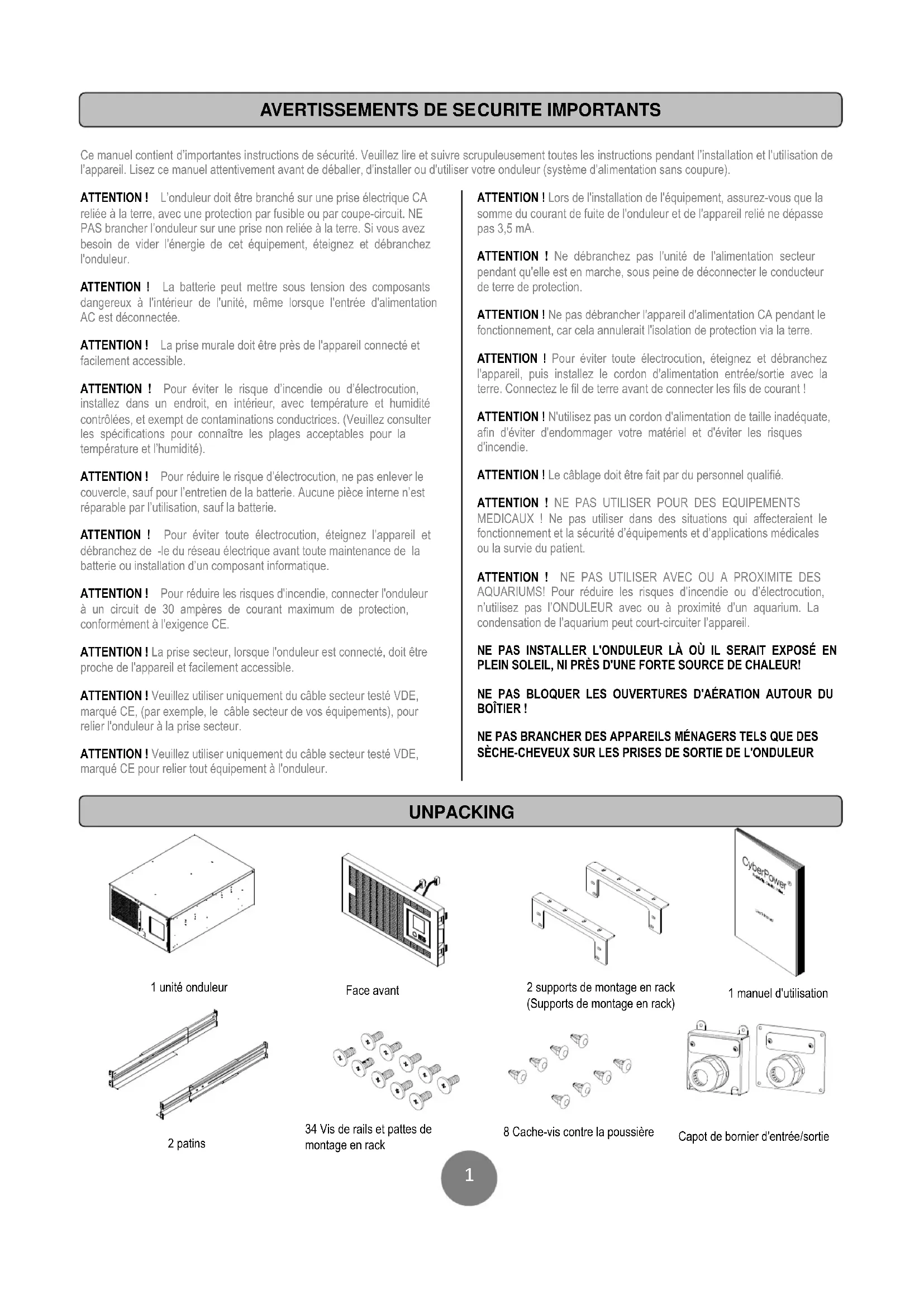 Ce manuel contient d'importantes instructions de sécurité. Veuillez lire et suivre scrupuleusement toutes les instructions pendant l'installation et l'utilisation de l'appareil. Lisez ce manuel attentivement avant de déballer, d'installer ou d'utiliser votre onduleur (système d'alimentation sans coupure).