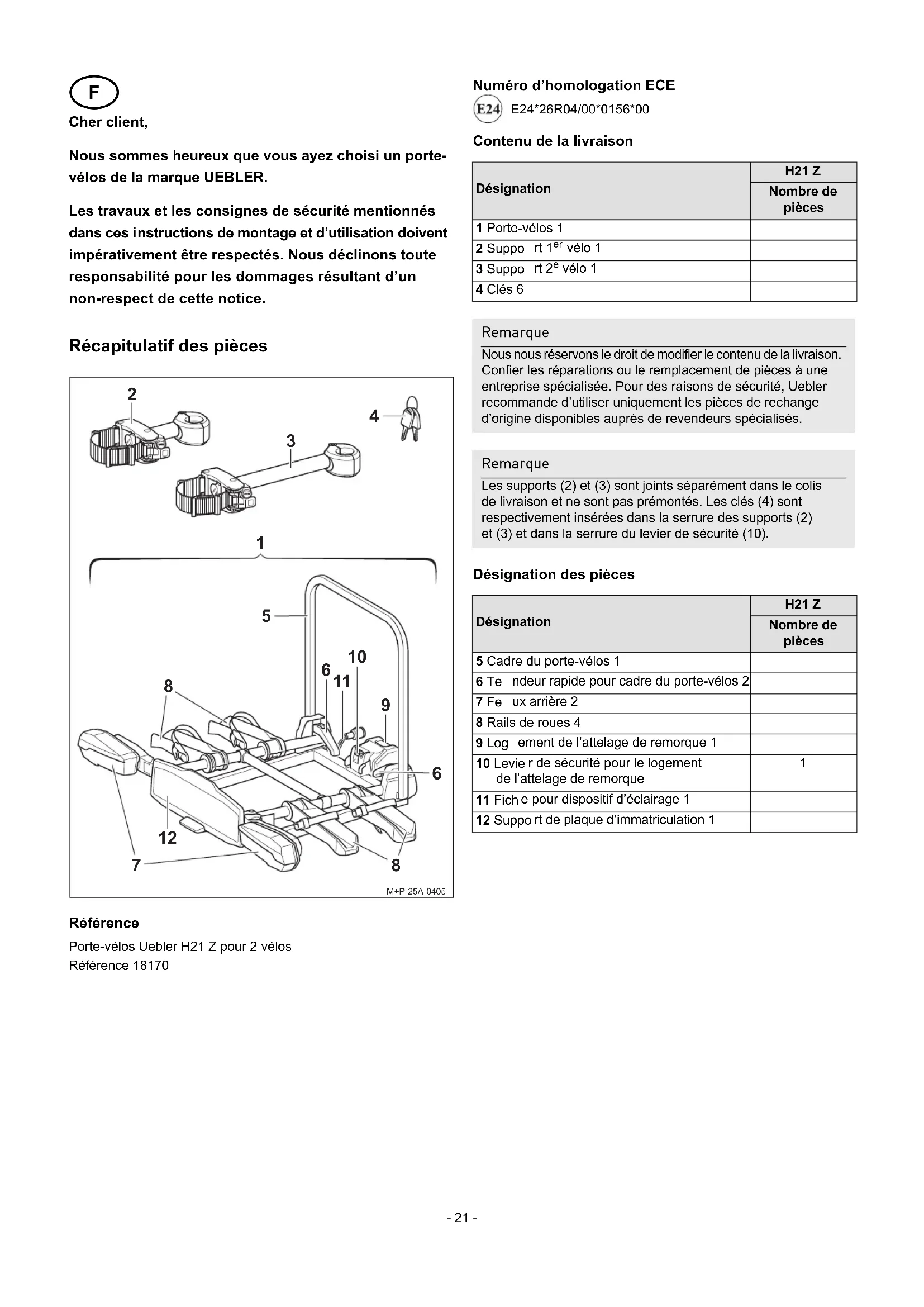 Cher client, Nous sommes heureux que vous ayez choisi un porte- vél os de la marque UEBLER. Les travaux et les consignes de sécurité mentionnés dans ces i nstructions de montage et d’utilisation doivent impérativement être respectés. Nous déclinons toute responsabilité pour les dommages résultant d’un non-respect de cette notice. Récapitulatif des pièces Référence Porte-vélos Uebler H21 Z pour 2 vélos Référence 18170 Numéro d’homologation ECE E24*26R04/00*0156*00 Contenu de la livraison Désignation des pièces