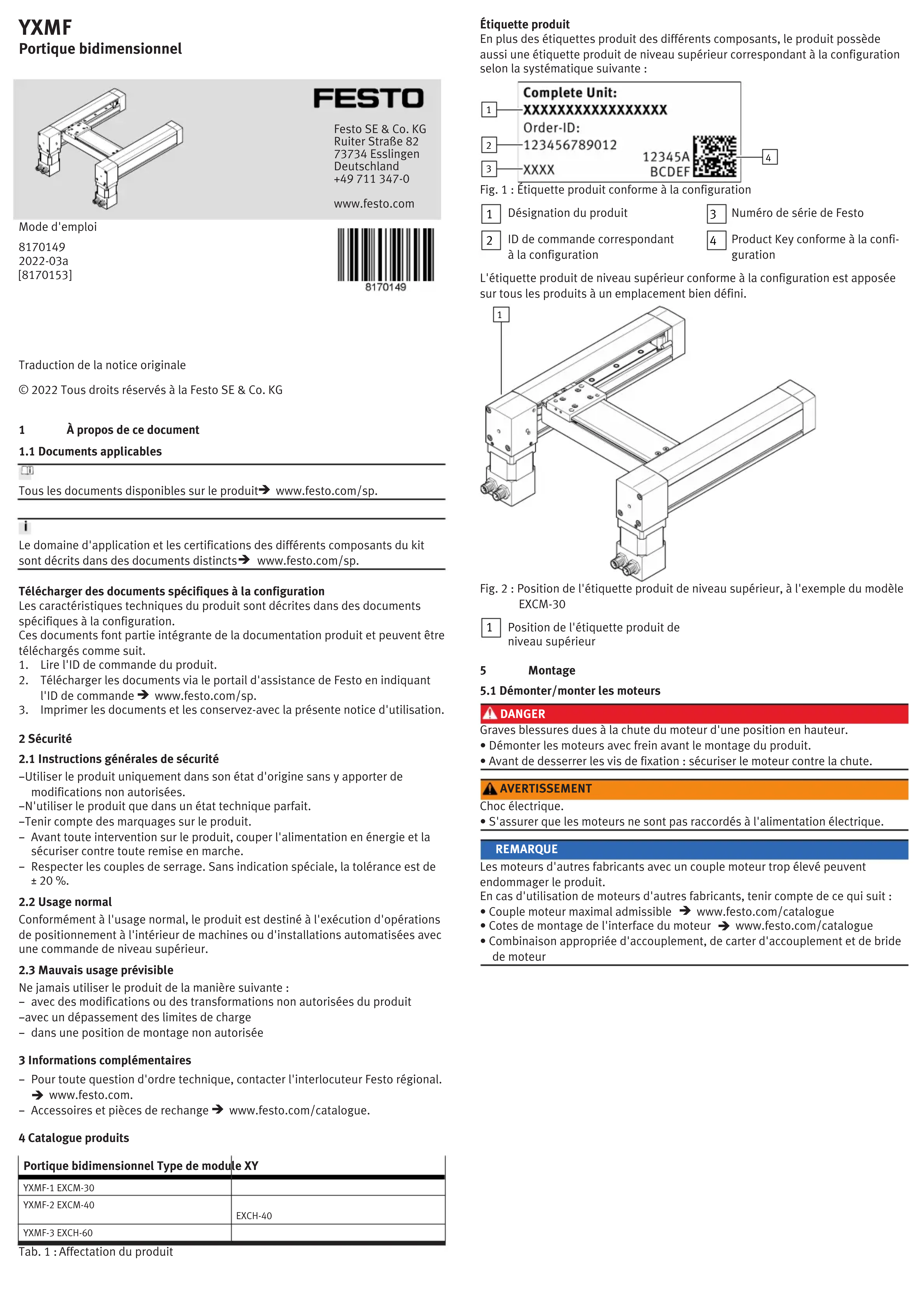 www.festo.com/catalogue. 4 Catalogue produits Portique bidimensionnel Type de module XY YXMF-1 EXCM-30YXMF-2 EXCM-40EXCH-40YXMF-3 EXCH-60 Tab. 1 : Affectation du produit Étiquette produit En plus des étiquettes produit des différents composants, le produit possède aussi une étiquette produit de niveau supérieur correspondant à la configuration selon la systématique suivante :