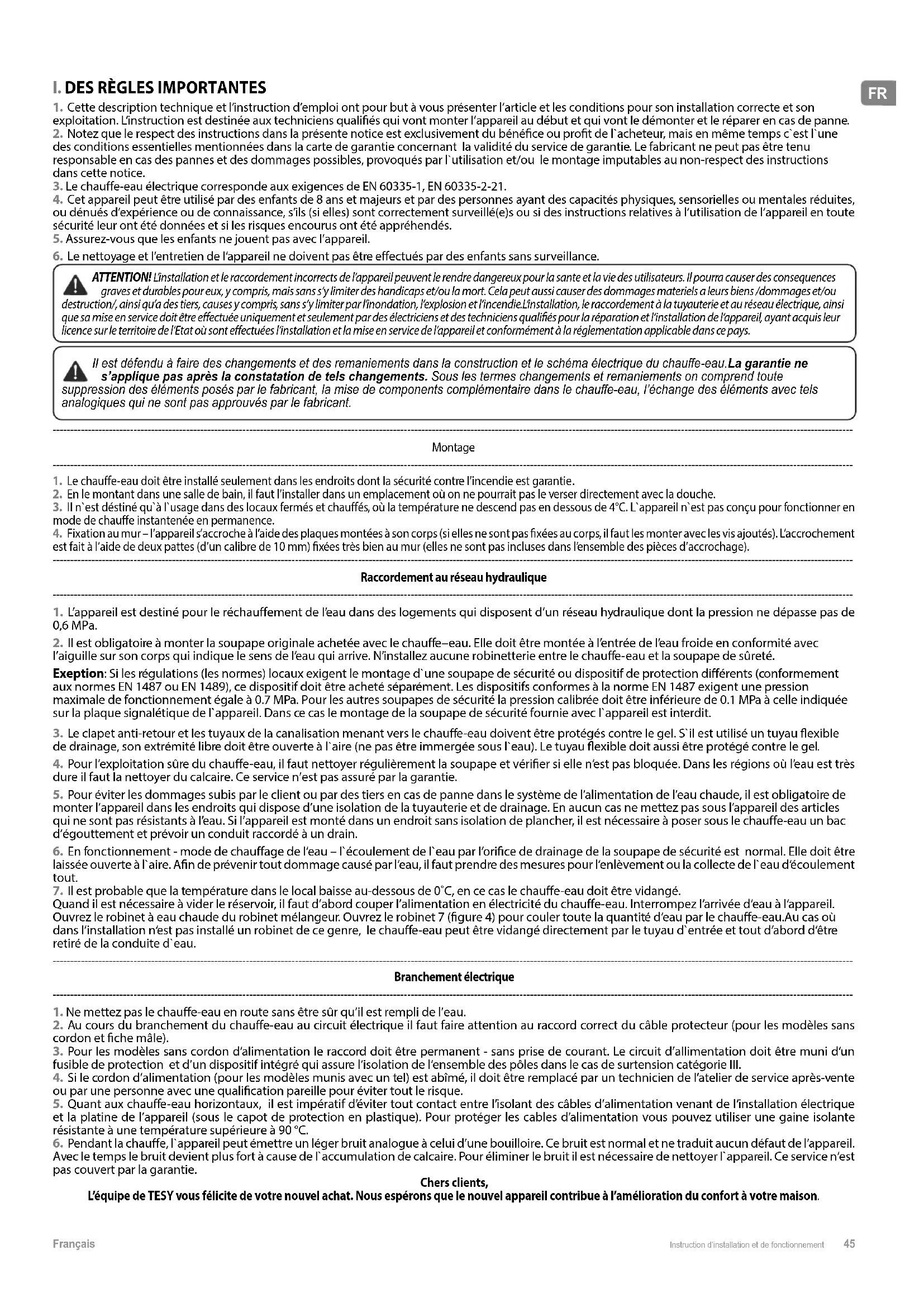 2. Au cours du branchement du chaue-eau au circuit électrique il faut faire attention au raccord correct du câble protecteur (pour les modèles sans cordon et che mâle). 3. Pour les modèles sans cordon d‘alimentation le raccord doit être permanent - sans prise de courant. Le circuit d’allimentation doit être muni d‘un fusible de protection et d’un dispositif intégré qui assure l‘isolation de l‘ensemble des pôles dans le cas de surtension catégorie III. 4. Si le cordon d’alimentation (pour les modèles munis avec un tel) est abîmé, il doit être remplacé par un technicien de l’atelier de service après-vente ou par une personne avec une qualication pareille pour éviter tout le risque. 5. Quant aux chaue-eau horizontaux, il est impératif d’éviter tout contact entre l’isolant des câbles d’alimentation venant de l’installation électrique et la platine de l’appareil (sous le capot de protection en plastique). Pour protéger les cables d’alimentation vous pouvez utiliser une gaine isolante résistante à une température supérieure à 90 °C. 6. Pendant la chaue, l`appareil peut émettre un léger bruit analogue à celui d’une bouilloire. Ce bruit est normal et ne traduit aucun défaut de l’appareil. Avec le temps le bruit devient plus fort à cause de l`accumulation de calcaire. Pour éliminer le bruit il est nécessaire de nettoyer l`appareil. Ce service n‘est pas couvert par la garantie. Chers clients, L’équipe de TESY vous félicite de votre nouvel achat. Nous espérons que le nouvel appareil contribue à l’amélioration du confort à votre maison.46 Instruction d’installation et de fonctionnement