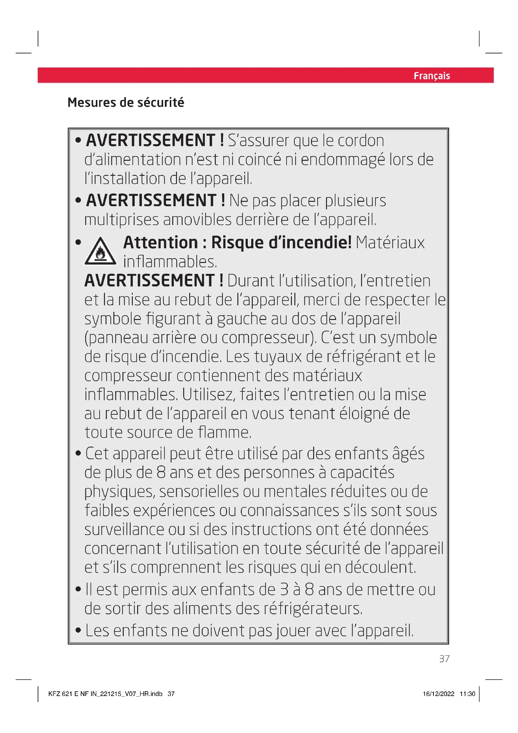 - Les enfants ne doivent pas jouer avec l’appareil. KFZ 621 E NF IN_221215_V07_HR.indb 37KFZ 621 E NF IN_221215_V07_HR.indb 37 16/12/2022 11:3016/12/2022 11:30Size - A5 Français
